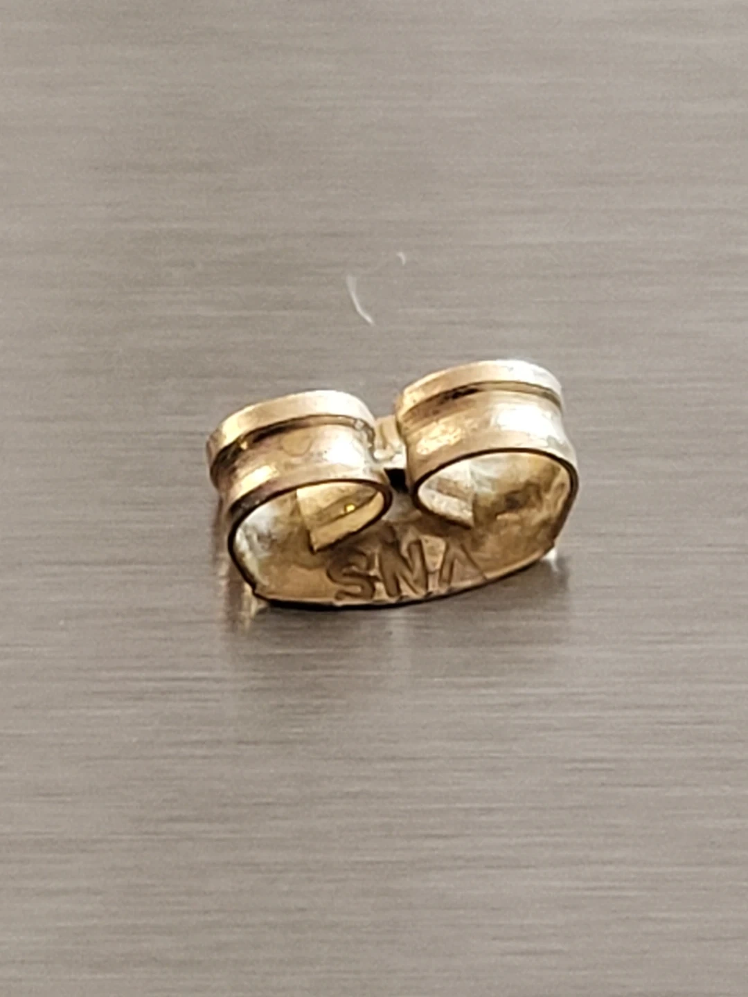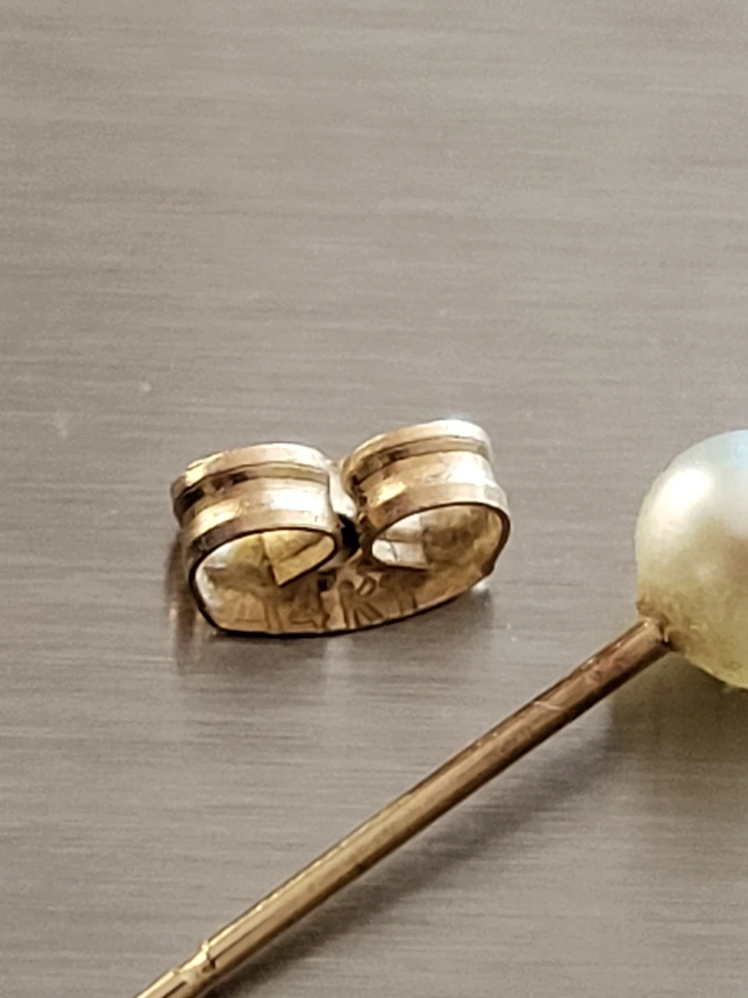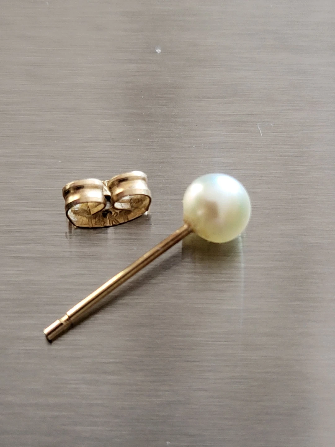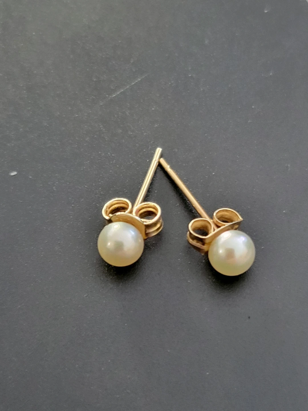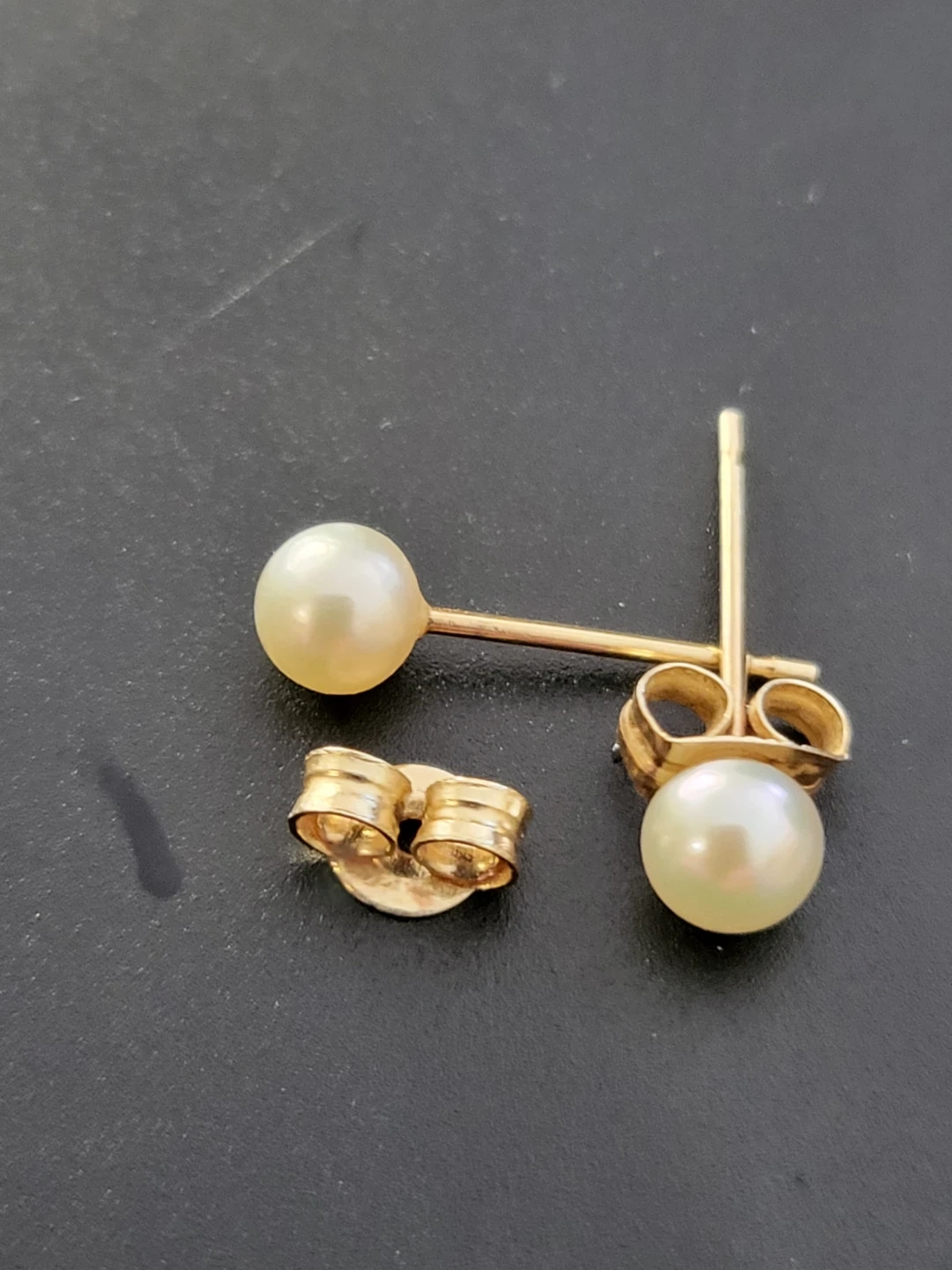 These are a pair of classic pearl 14k gold stud earrings with gold posts and backs. The pearls are small 4mm and a natural cream colour. They're elegant and timeless!