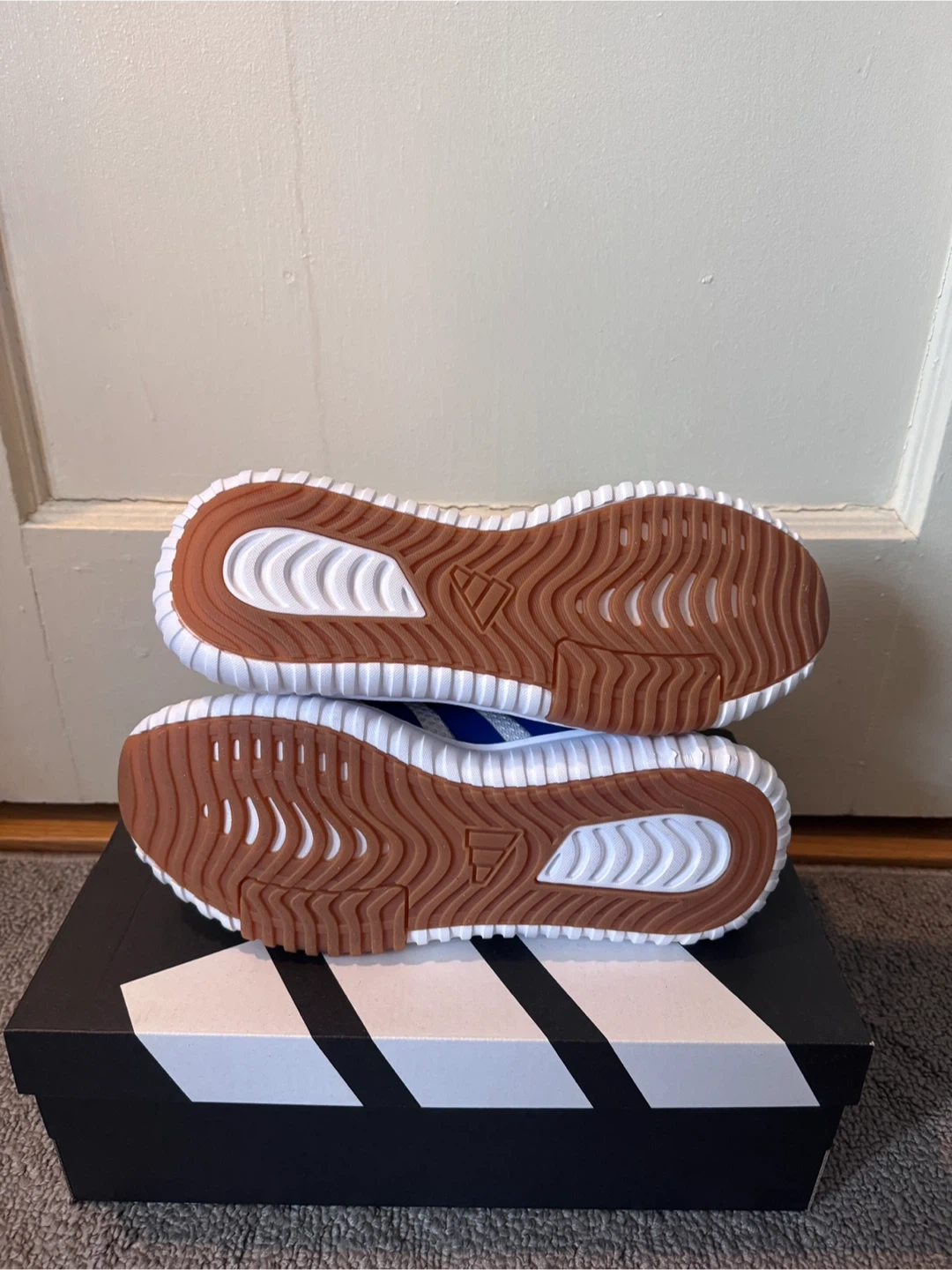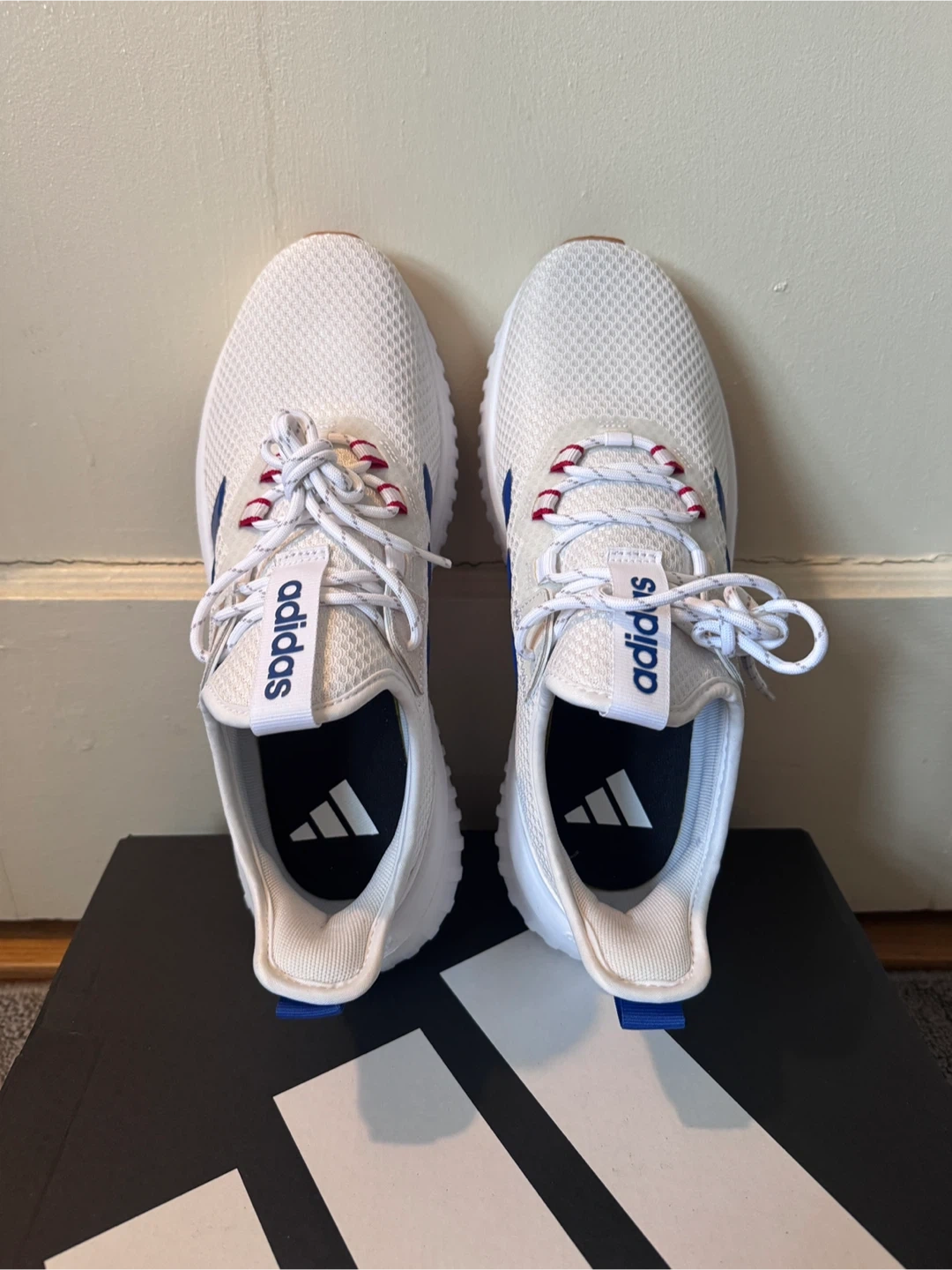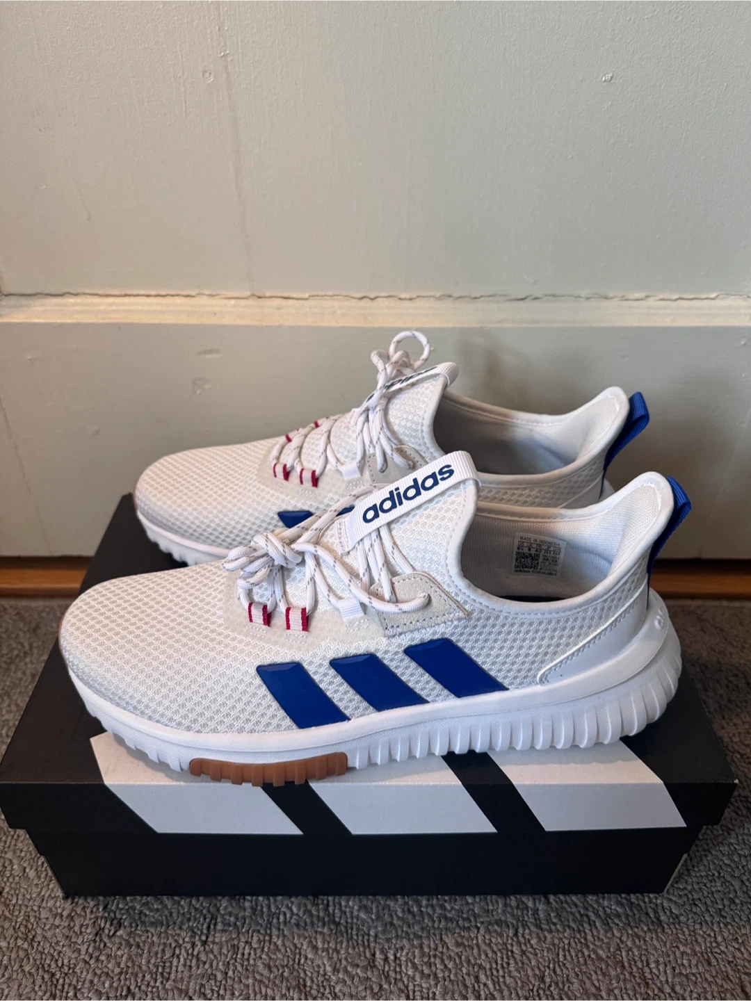 White Adidas athletic White shoes with blue stripes. Features Cloudfoam cushioning for comfort. Includes original box.