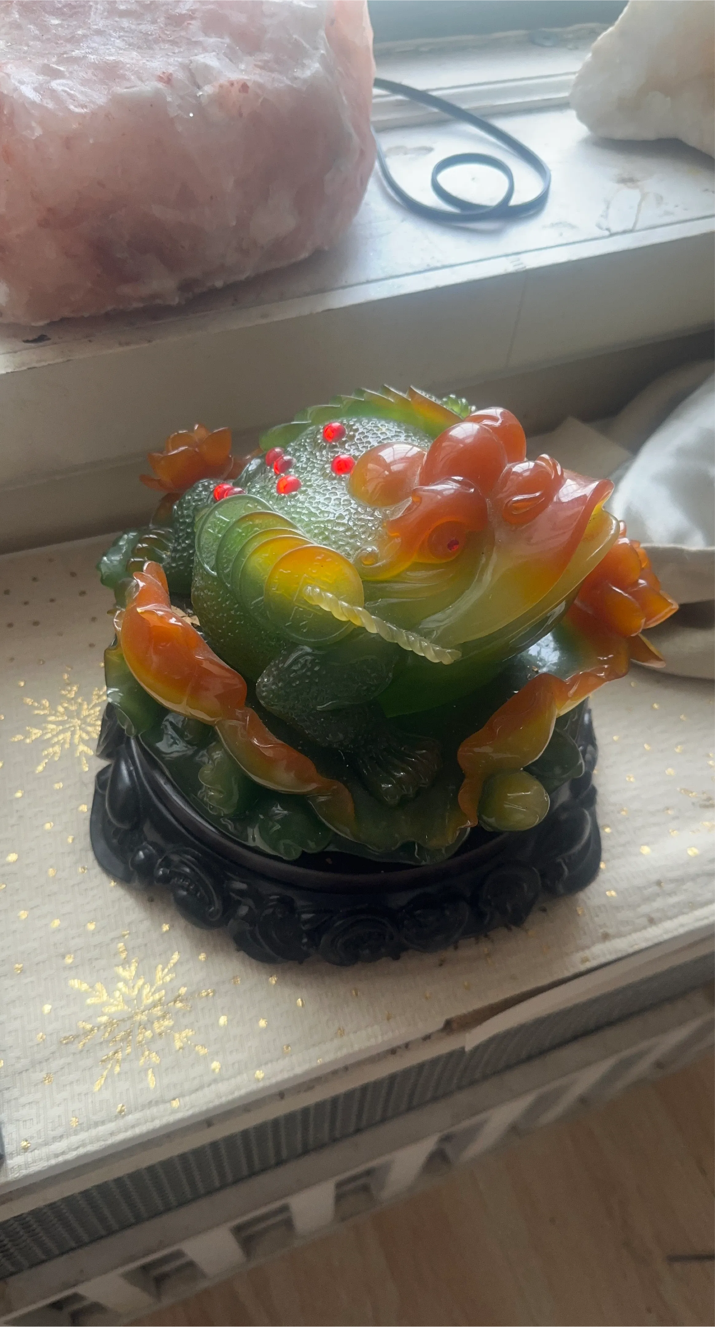 This is a decorative figurine of a frog with coins and flowers. It's made of translucent green and orange material, resembling jade. The base is black and ornate. It's a charming piece for display!
