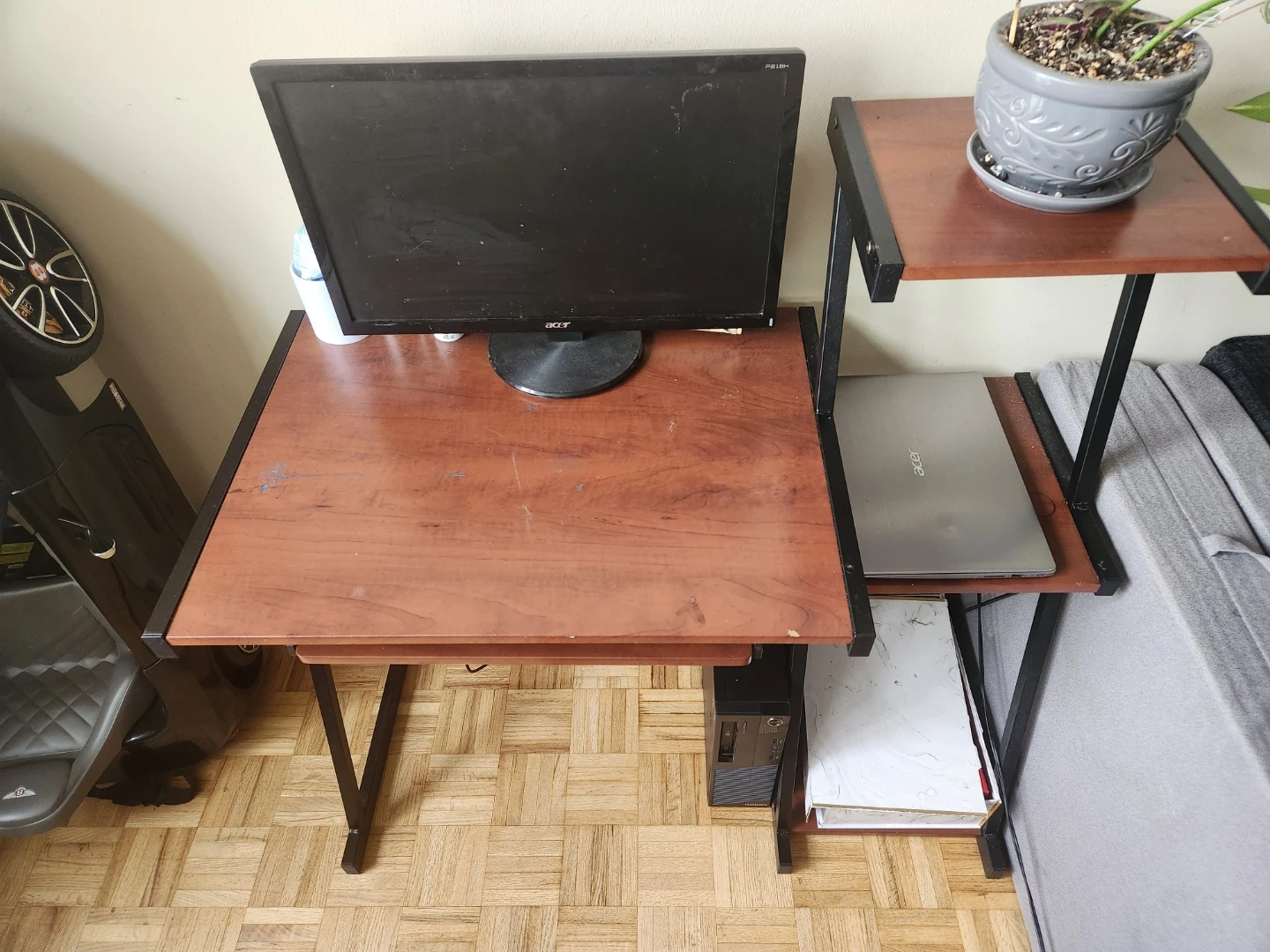 This compact computer desk features a warm wood grain finish on its desktop and a sturdy black metal frame. It includes a slide-out keyboard tray and a side shelf, perfect for organizing your computer setup. The desk's slim design makes it suitable for smaller spaces. Great for a home office or student dorm! Very light in weight. Slight damage to faux wood on one side as shown in last picture. Desk only.