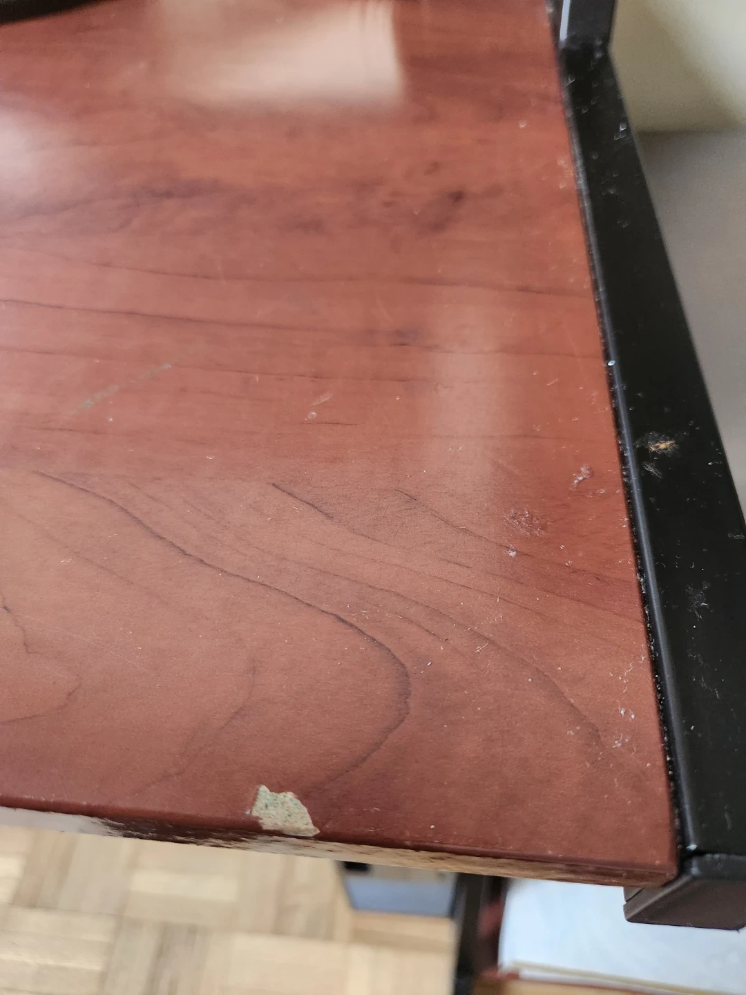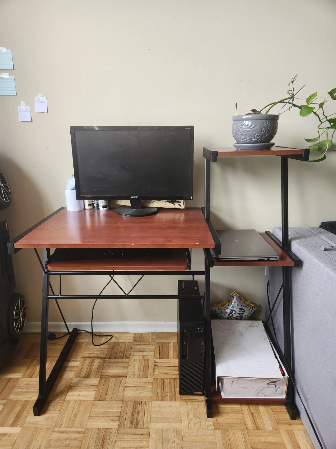 This compact computer desk features a warm wood grain finish on its desktop and a sturdy black metal frame. It includes a slide-out keyboard tray and a side shelf, perfect for organizing your computer setup. The desk's slim design makes it suitable for smaller spaces. Great for a home office or student dorm! Very light in weight. Slight damage to faux wood on one side as shown in last picture. Desk only.