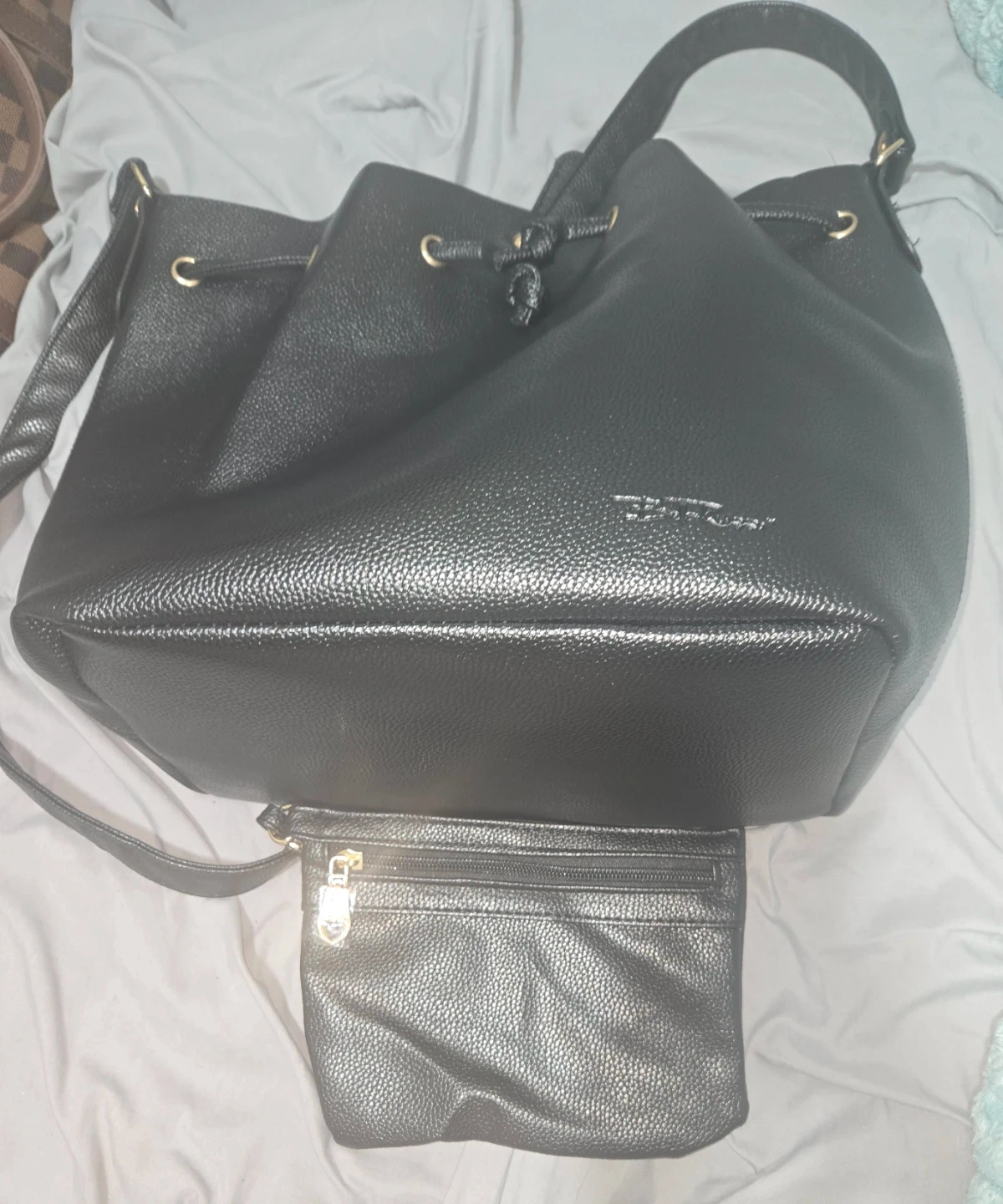 Never been used Stylish black faux leather bucket bag by Bella Russo. It features a drawstring closure and comes with a matching zippered pouch. This bag's interior is lined and has ample space for your daily essentials. It's a versatile accessory for everyday use!