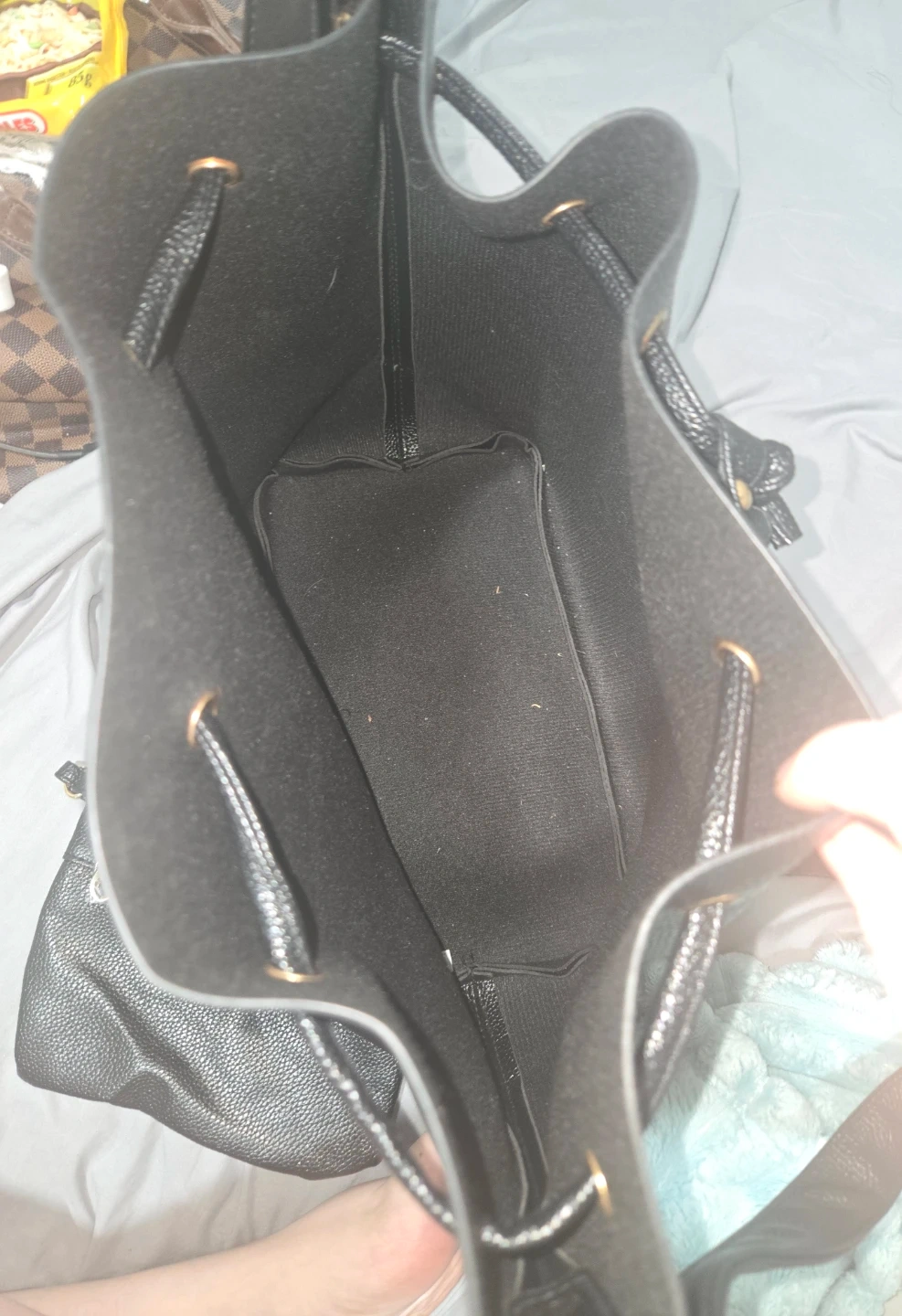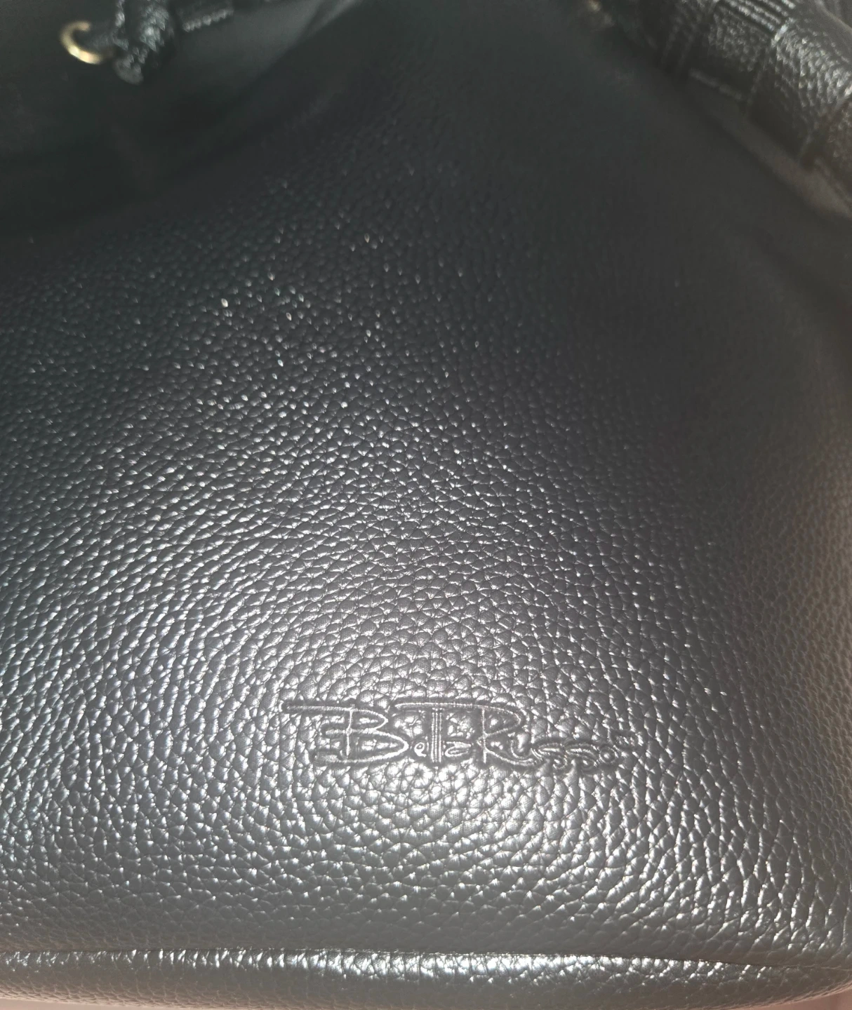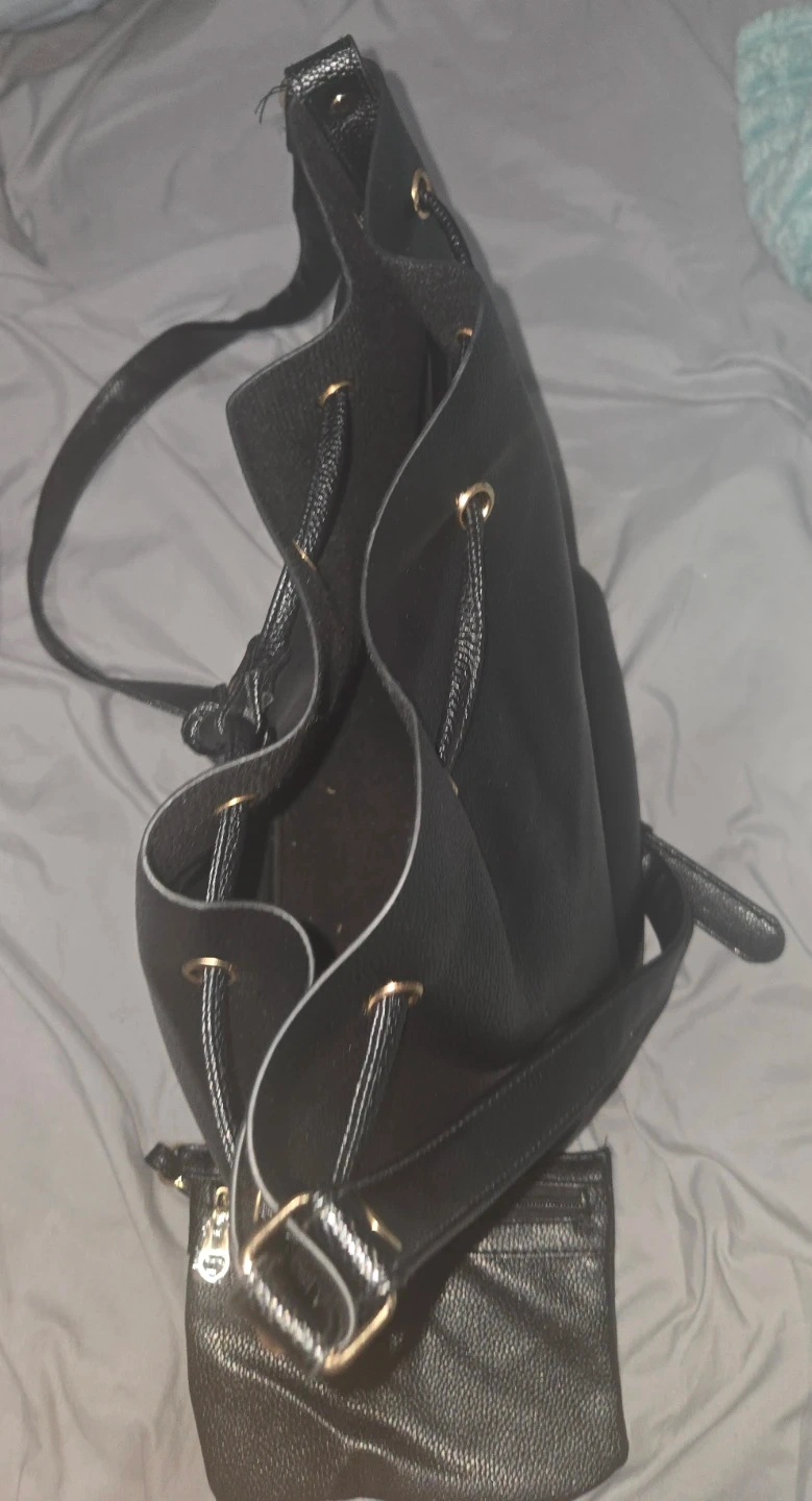 Never been used Stylish black faux leather bucket bag by Bella Russo. It features a drawstring closure and comes with a matching zippered pouch. This bag's interior is lined and has ample space for your daily essentials. It's a versatile accessory for everyday use!