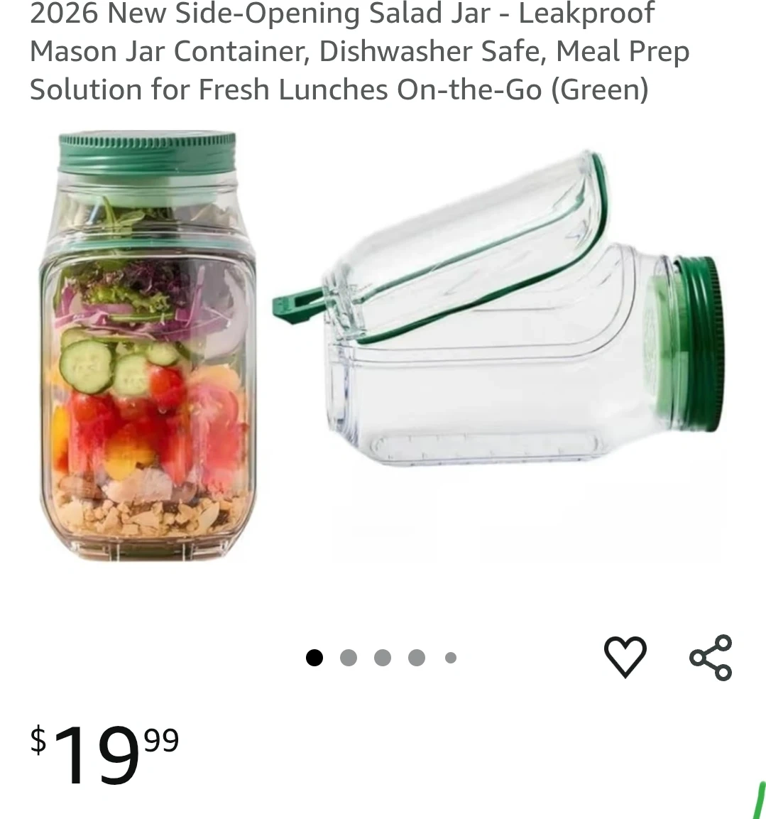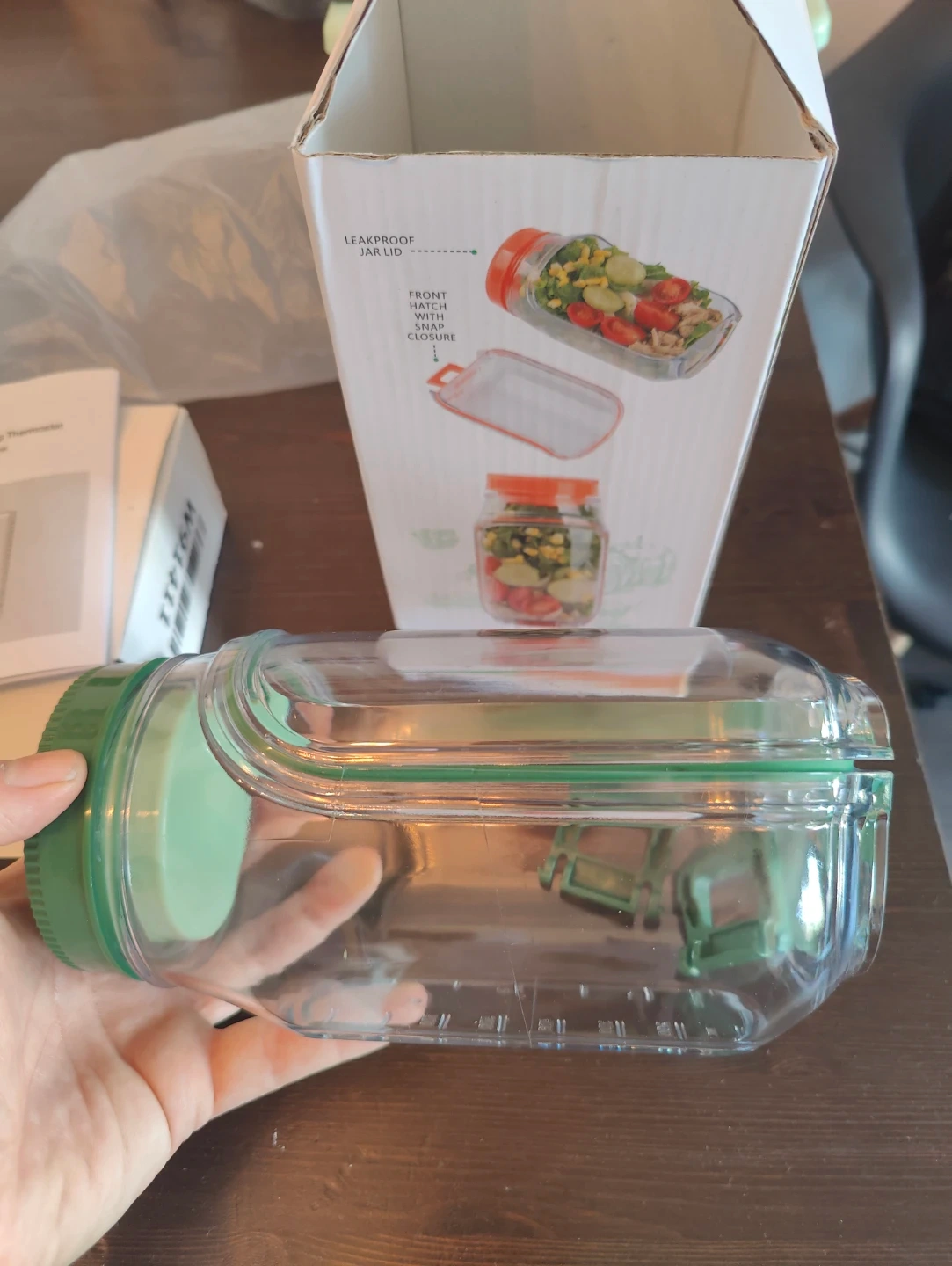 This is a leakproof salad jar with a side-opening lid. It's dishwasher safe and great for meal prep. The jar is made of clear plastic with a green lid and band.