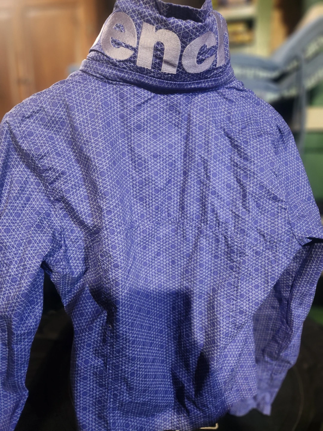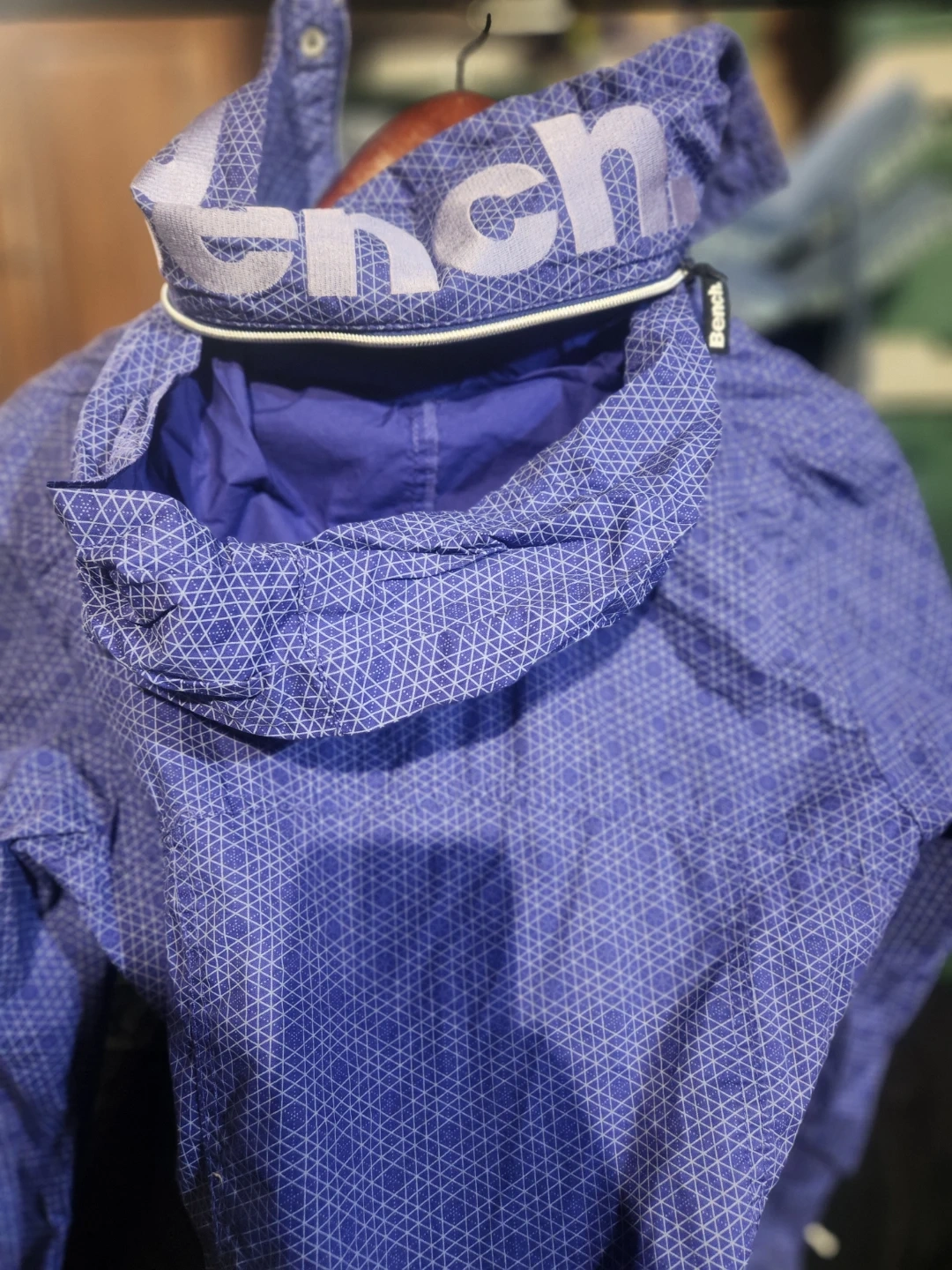 This Bench jacket comes in a vibrant blue with a subtle geometric pattern all over. It's got a full zipper closure and a handy hood. Great for a light layer when you're out and about!