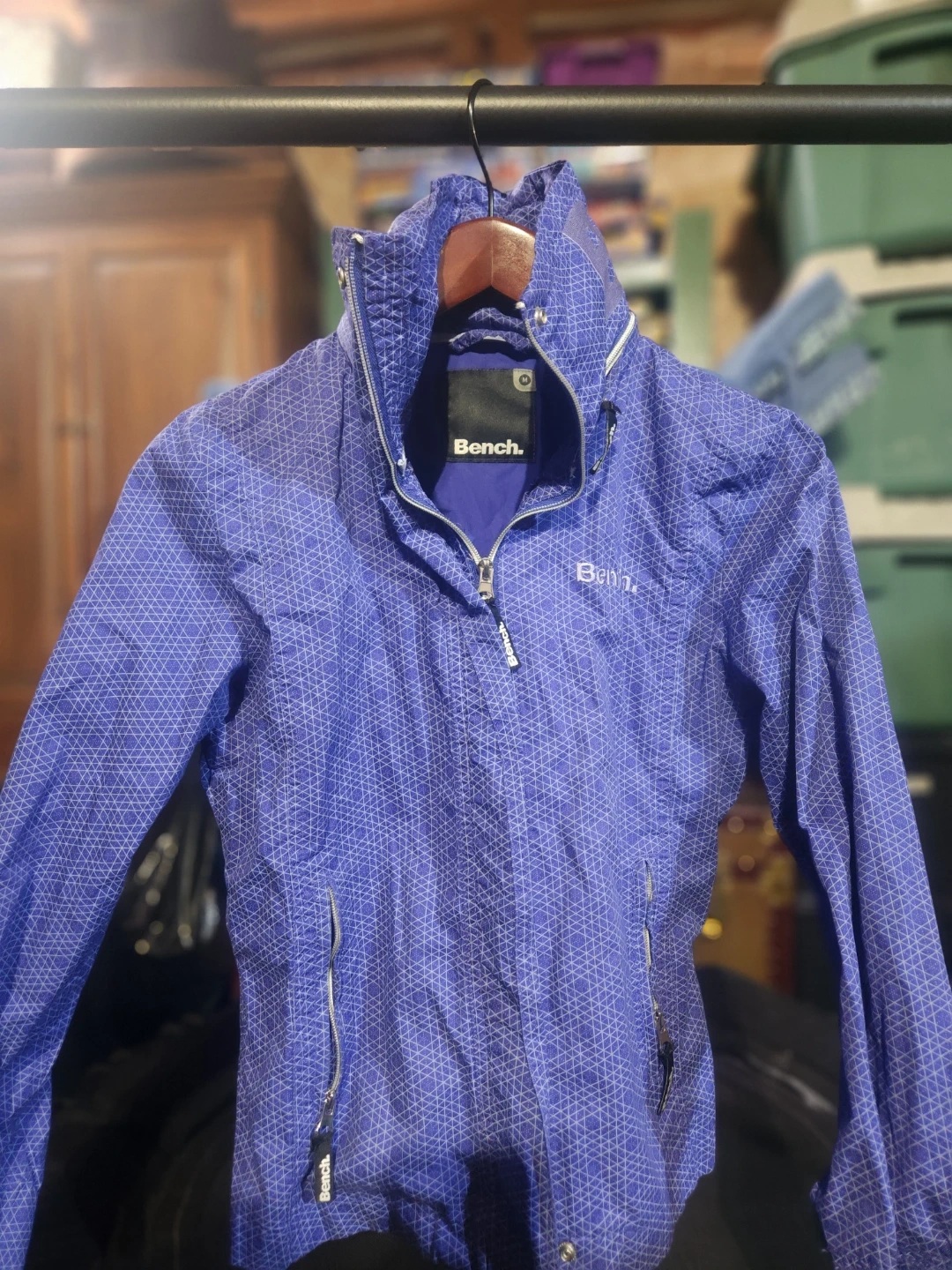 This Bench jacket comes in a vibrant blue with a subtle geometric pattern all over. It's got a full zipper closure and a handy hood. Great for a light layer when you're out and about!