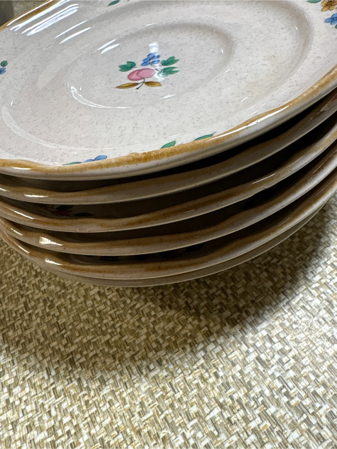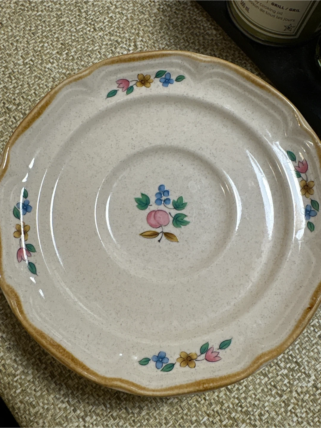 Set of 6 International China stoneware plates. Features a speckled beige design with a floral accent and a brown rim. Made in Japan. It's stoneware material.