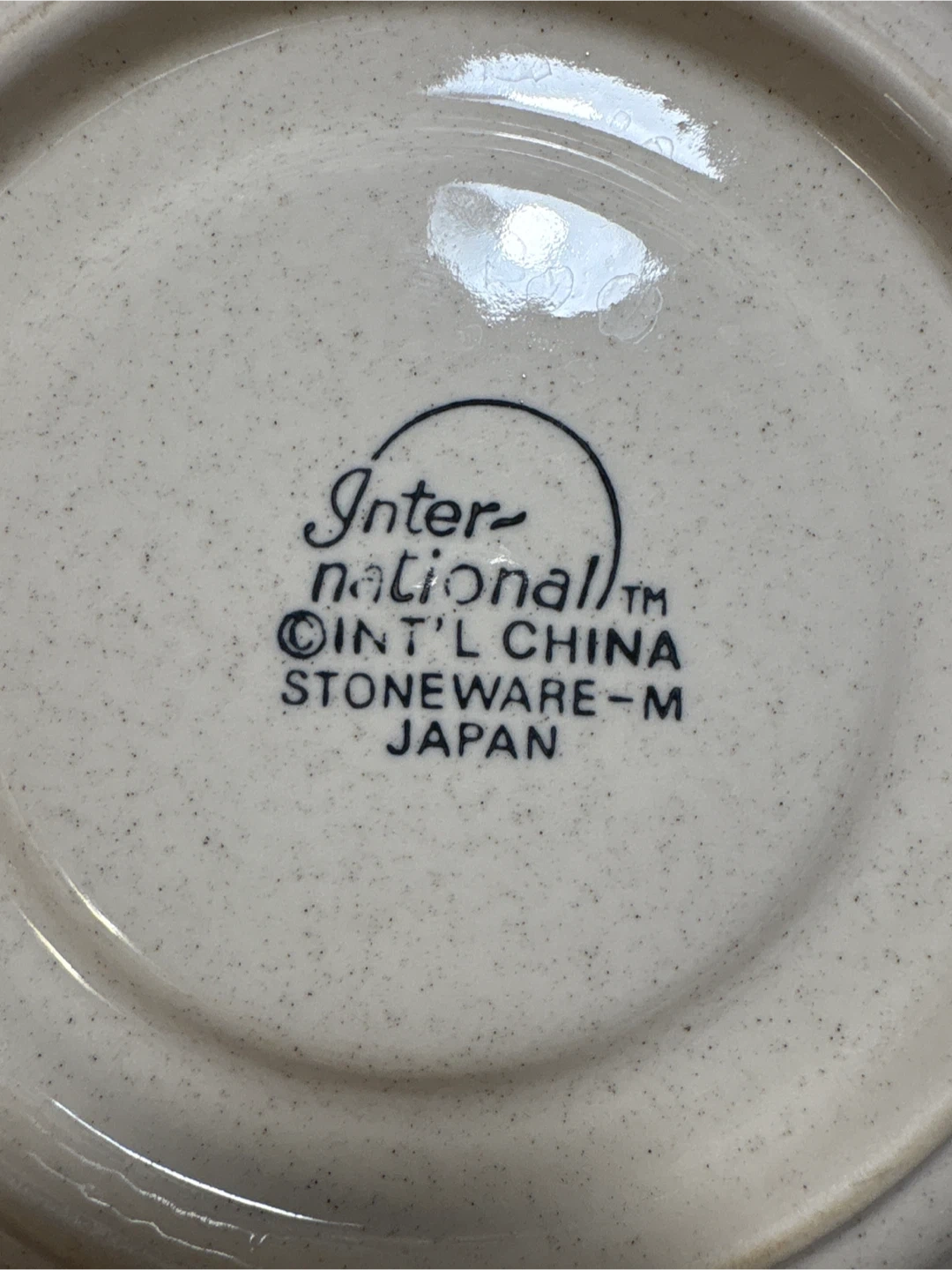 Set of 6 International China stoneware plates. Features a speckled beige design with a floral accent and a brown rim. Made in Japan. It's stoneware material.