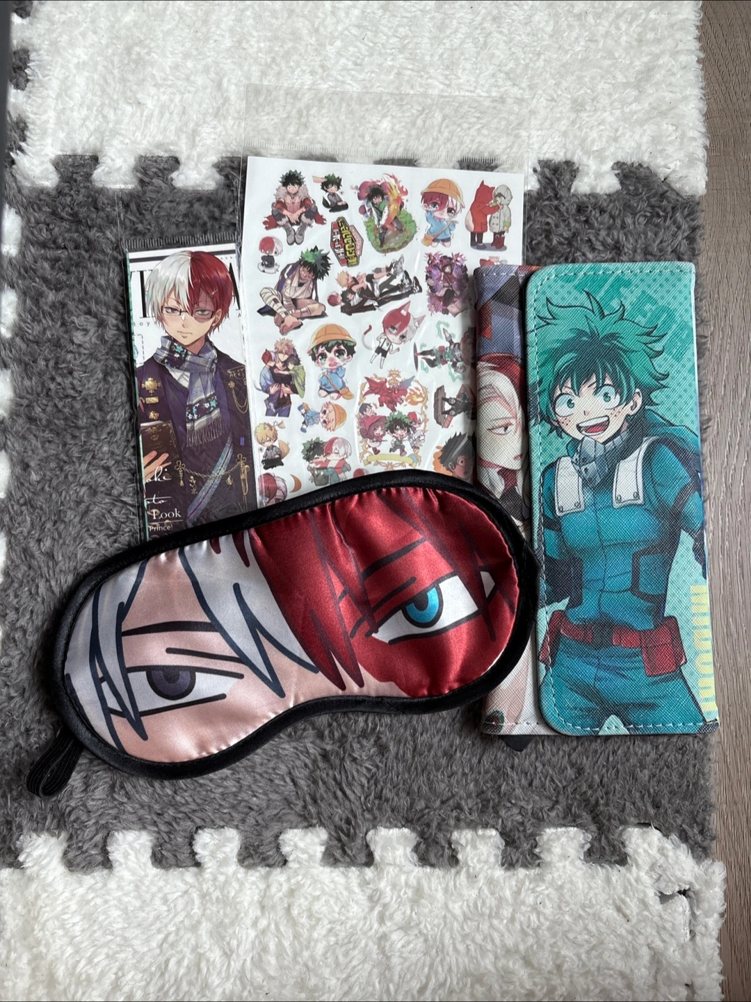This is a bundle that comes with a wallet, eye mask, bookmarks and stickers! All of these are brand new and need a new home fast!