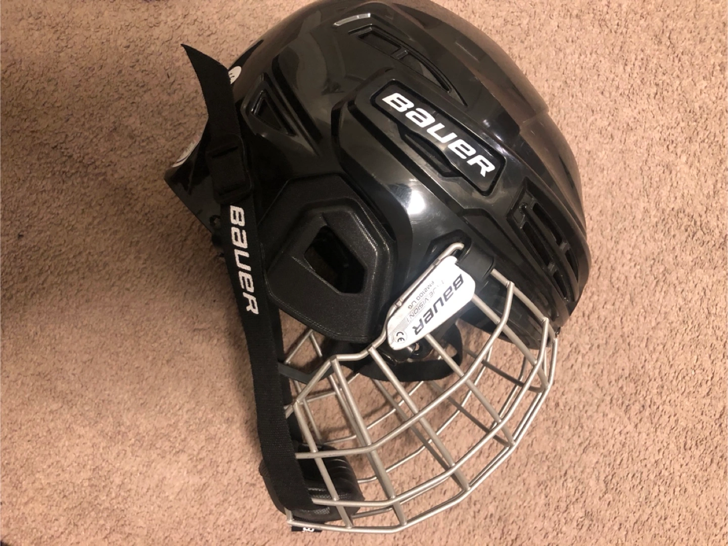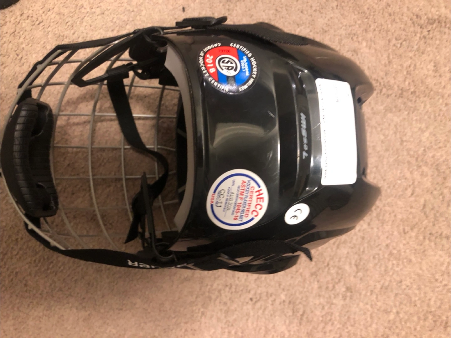 Hockey helmet featuring a black colour. Includes a cage and straps. Imagine how focused you'll feel on the ice wearing this.