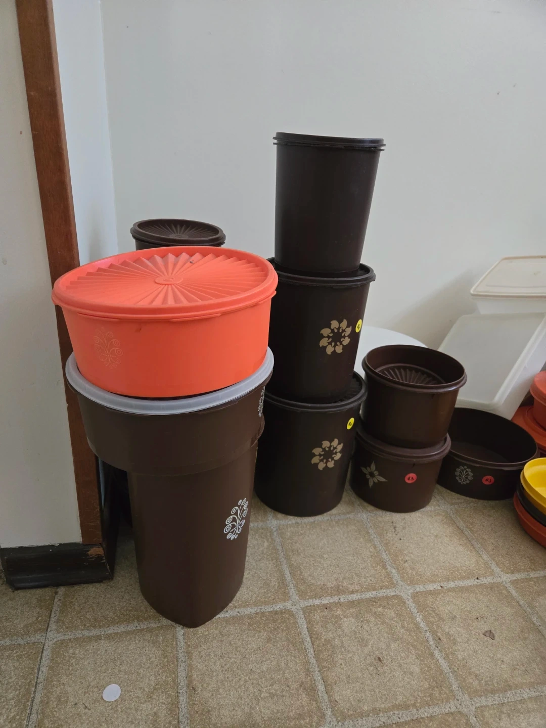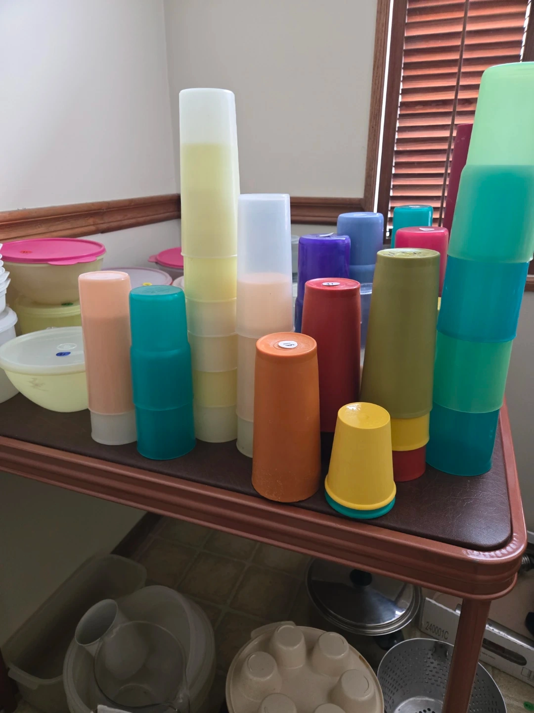 A collection of Tupperware storage containers and tumblers in various sizes and colours. Includes round and rectangular containers with lids, plus stacks of drinking tumblers. Must take all over 100 pieces