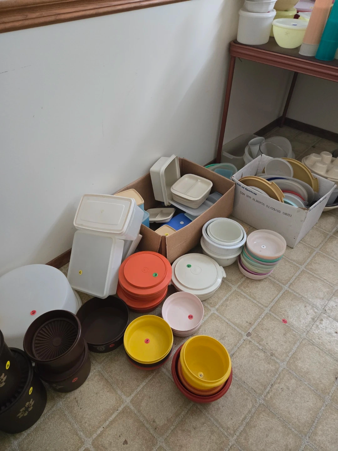 A collection of Tupperware storage containers and tumblers in various sizes and colours. Includes round and rectangular containers with lids, plus stacks of drinking tumblers. Must take all over 100 pieces