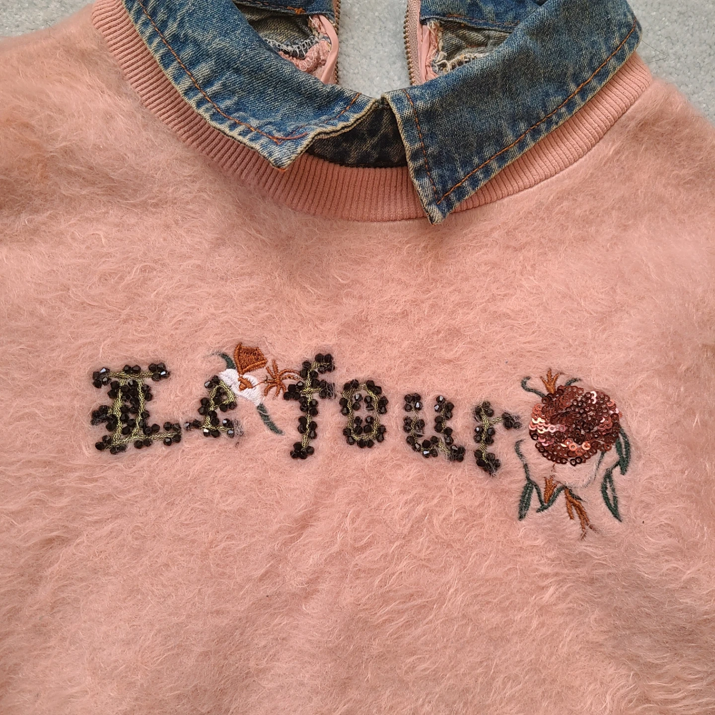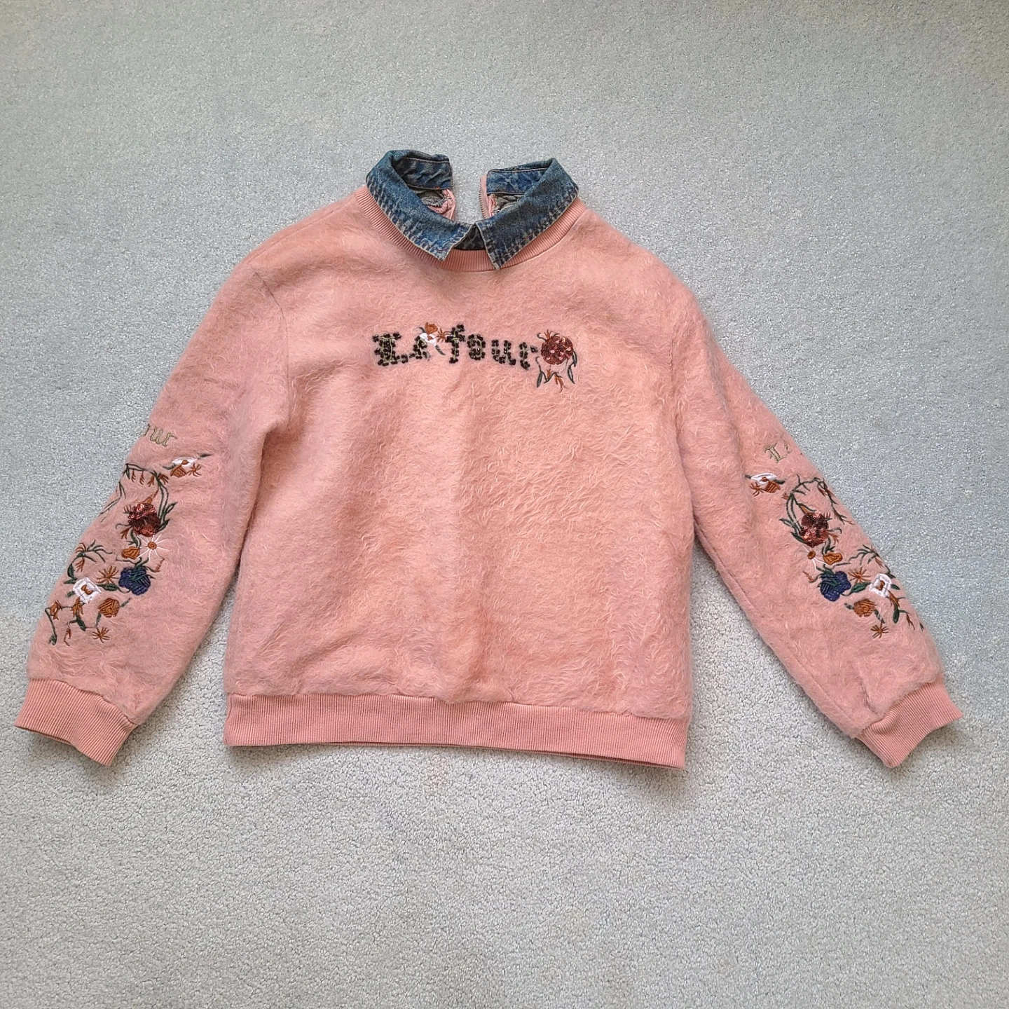 This pink fuzzy sweatshirt features a denim collar and embroidered details on the sleeves and front. It has a half-zip closure at the back. The main body is a soft, fuzzy material. Fits a size XS or S.