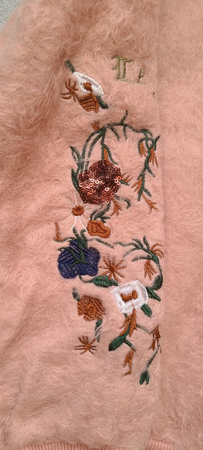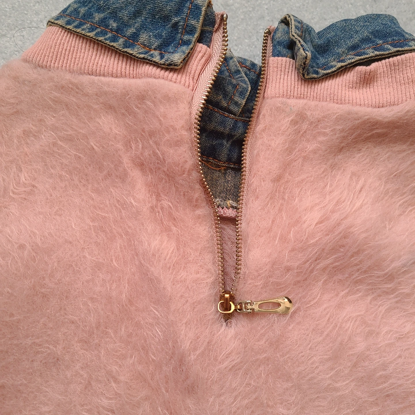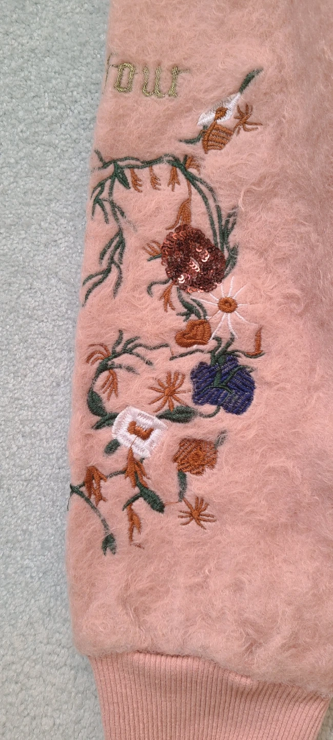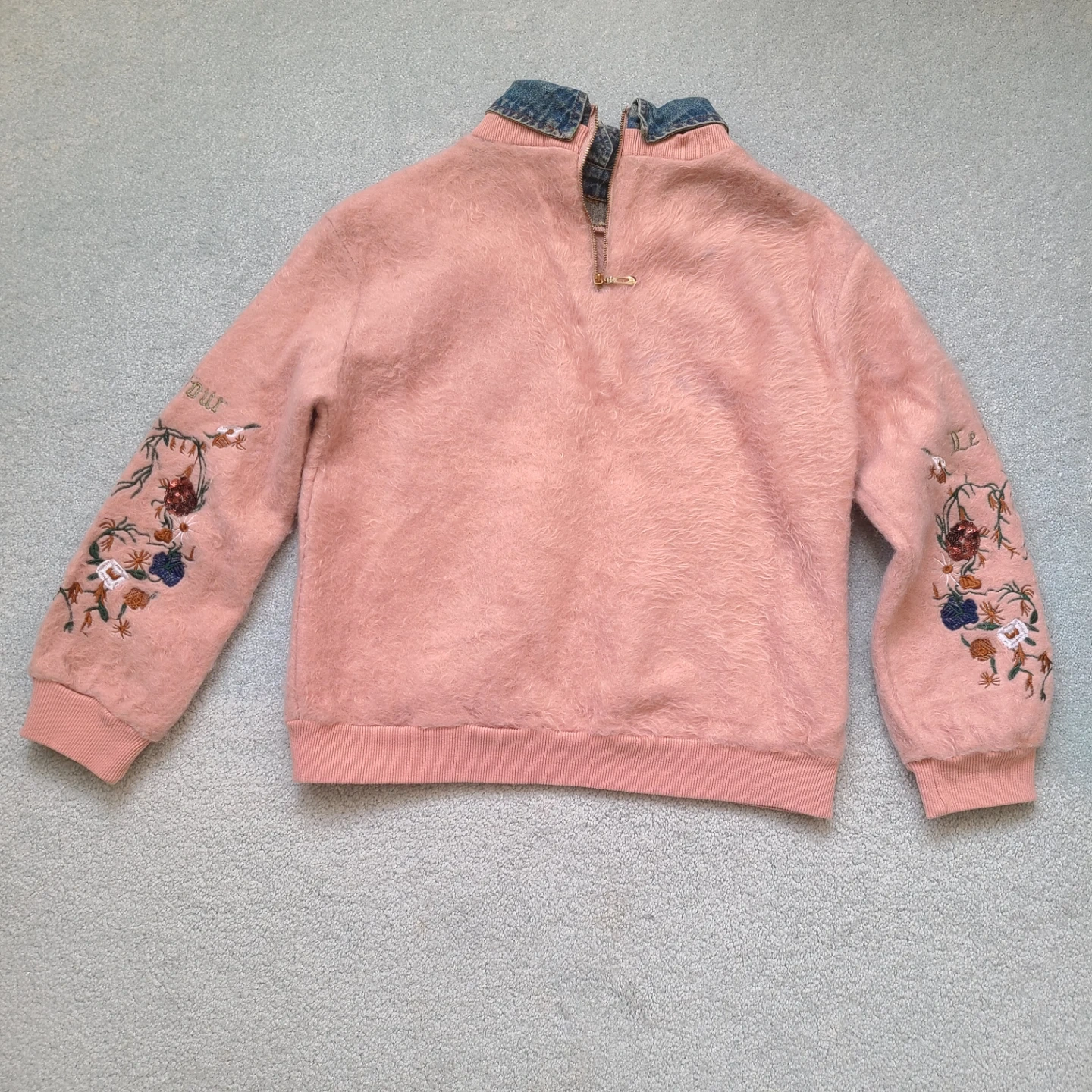 This pink fuzzy sweatshirt features a denim collar and embroidered details on the sleeves and front. It has a half-zip closure at the back. The main body is a soft, fuzzy material. Fits a size XS or S.