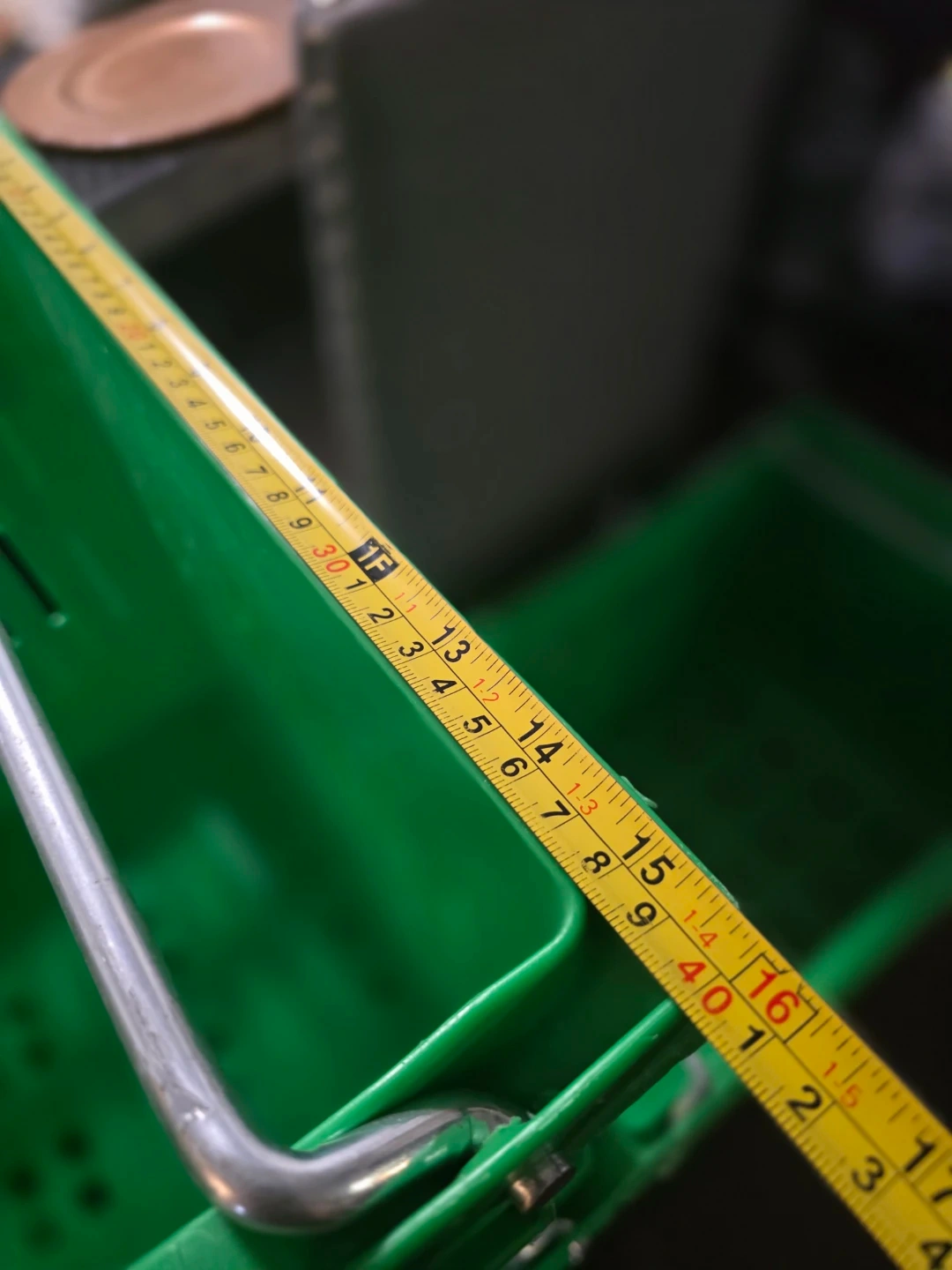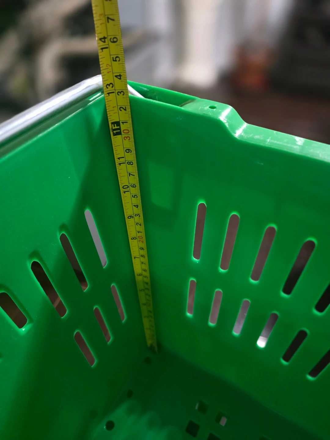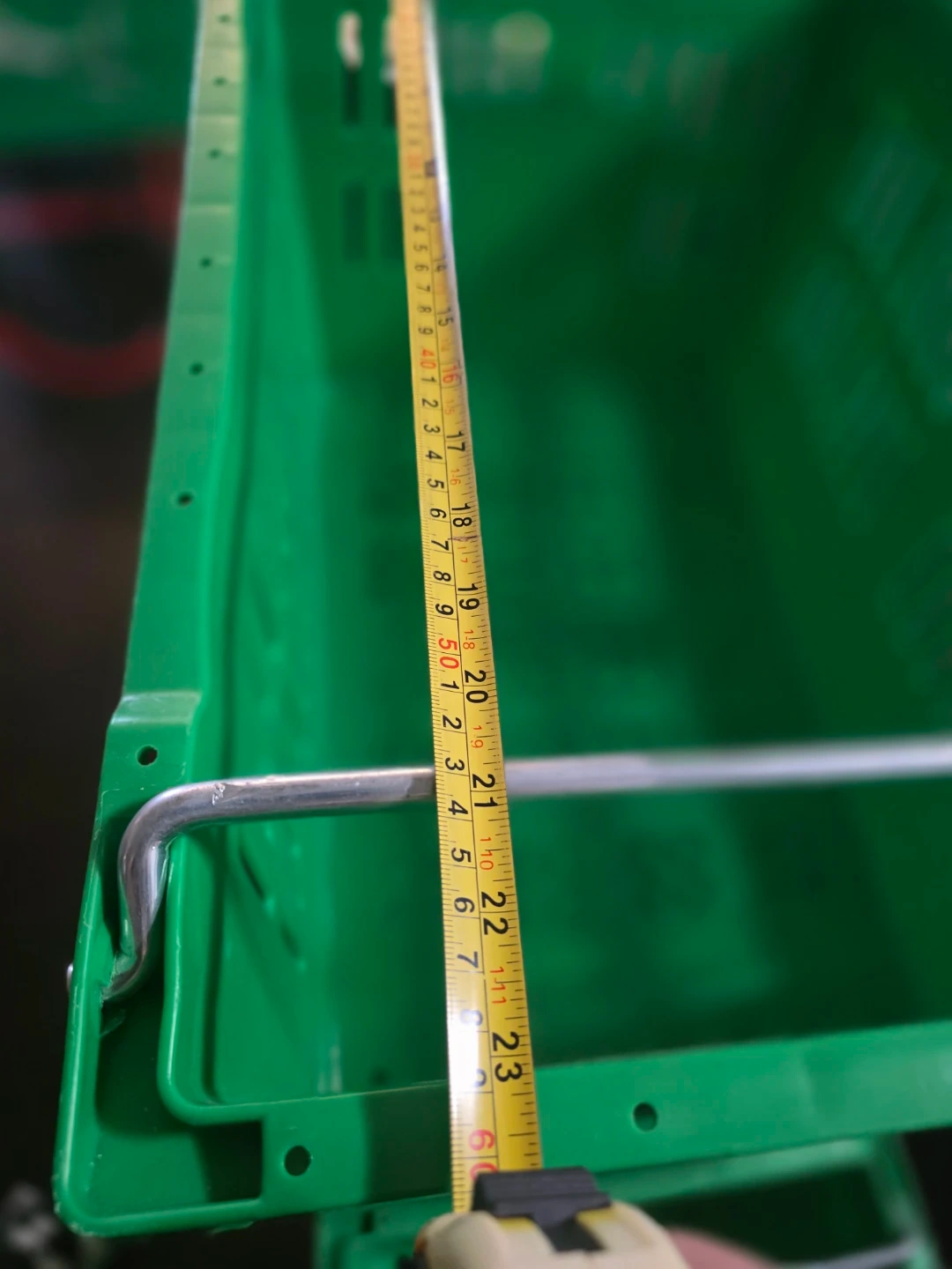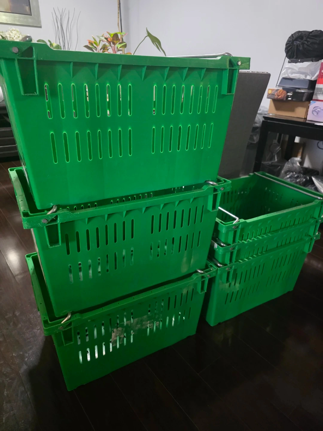 6 sturdy green plastic crates with convenient metal handles. These baskets measure approximately 22 inches in length. Perfect for organizing, storage, or carrying various items. Easy to stack when not in use.