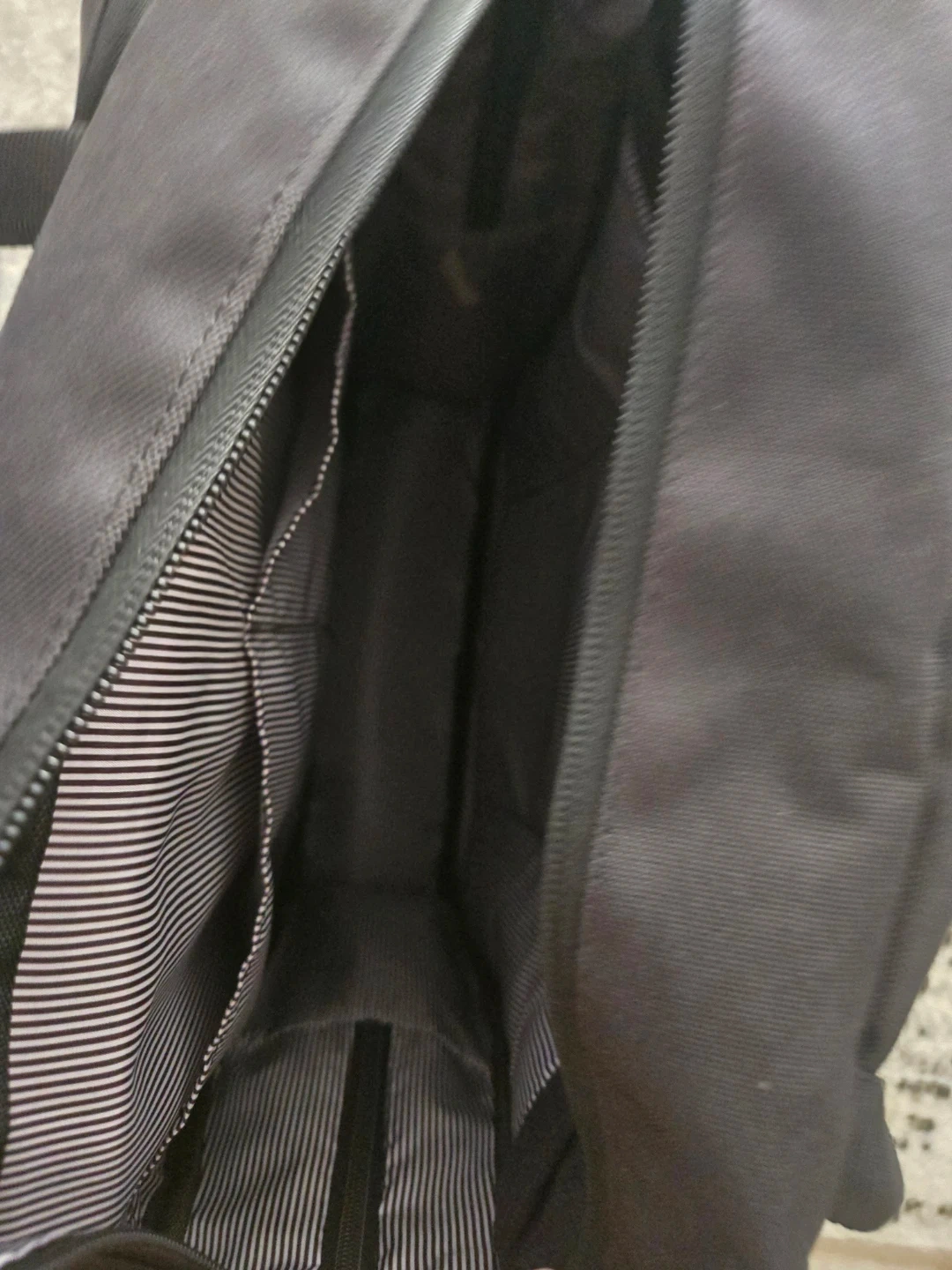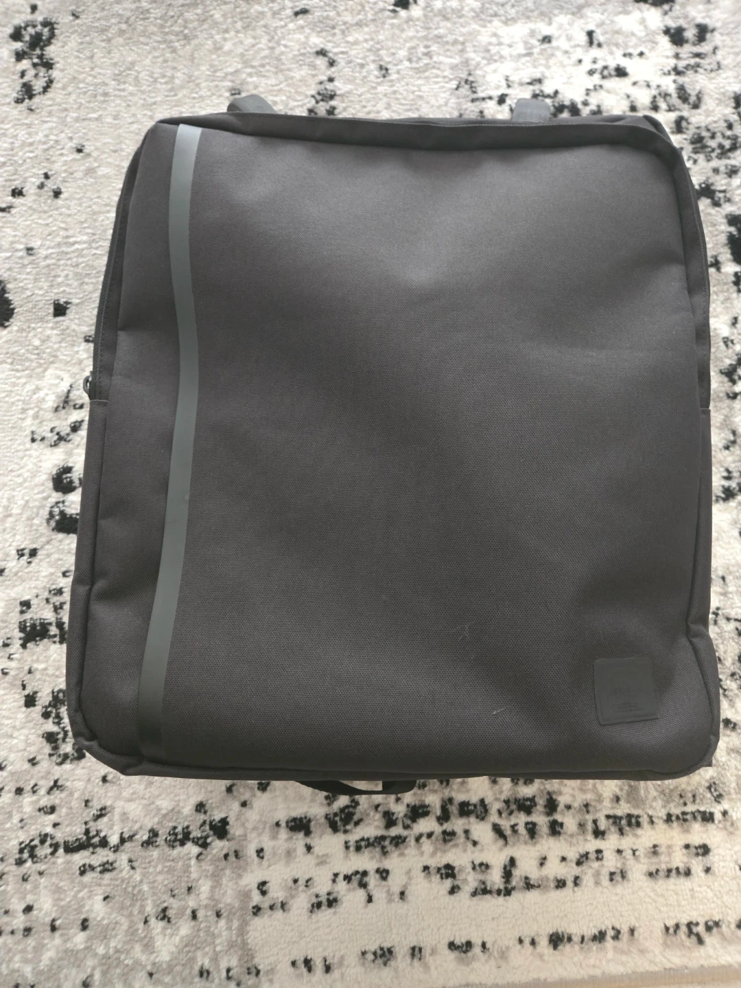 Black Herschel backpack with striped interior lining. It has adjustable padded shoulder straps for comfort. This bag's durable fabric is great for everyday use.