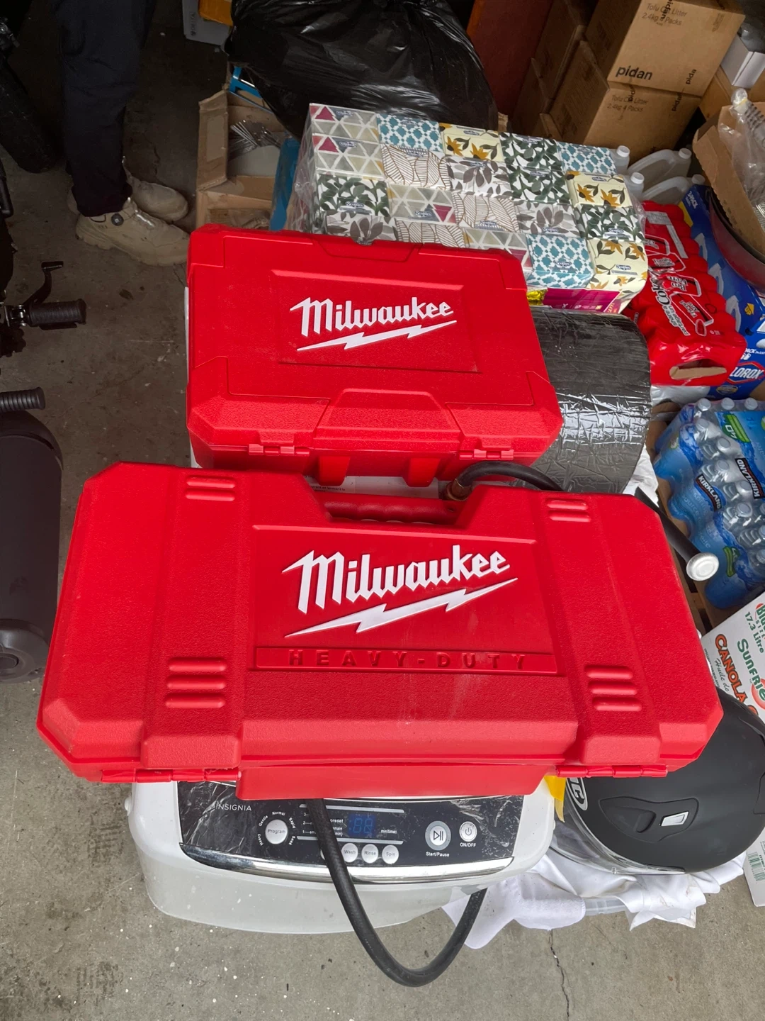 Two red Milwaukee heavy-duty tool cases. These durable cases are great for storing and transporting tools. Both cases are bright red and feature the Milwaukee logo.