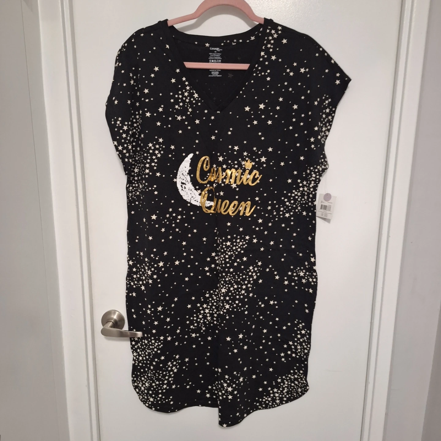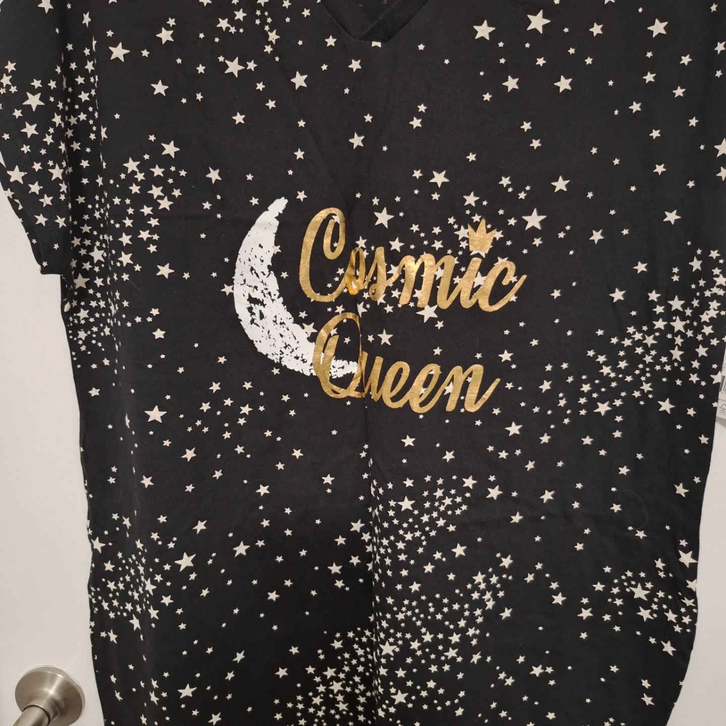 Black v-neck nightgown with a "Cosmic Queen" graphic and all-over star print. Made with 100% organic cotton. Wash with like colors. Size is 1X.