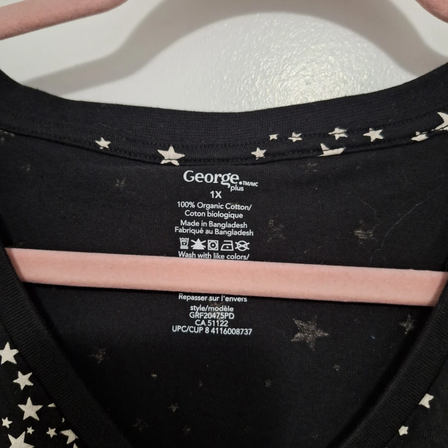 Black v-neck nightgown with a "Cosmic Queen" graphic and all-over star print. Made with 100% organic cotton. Wash with like colors. Size is 1X.