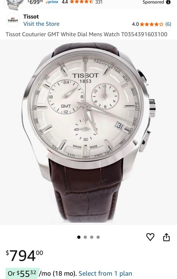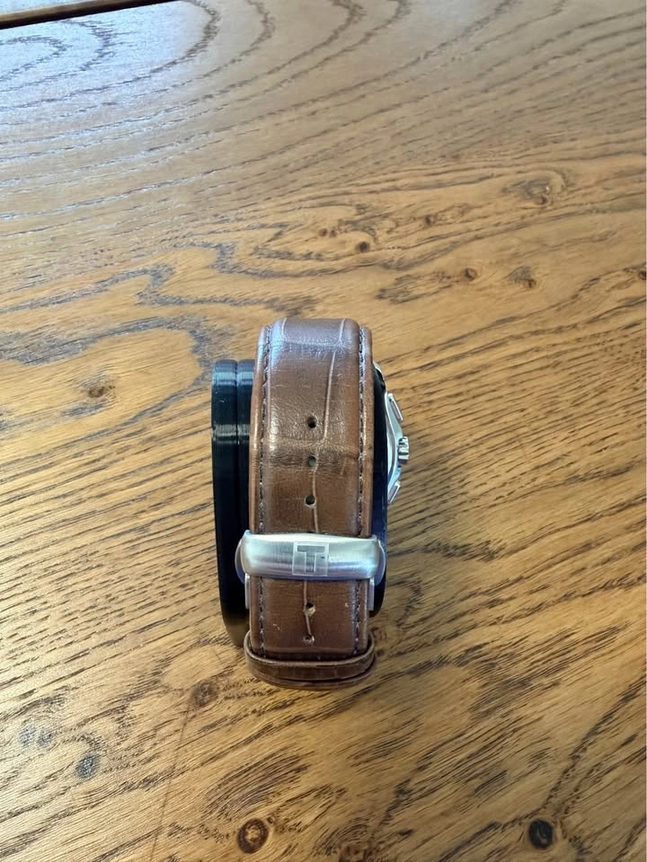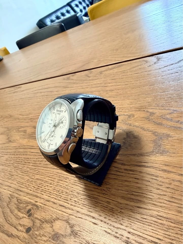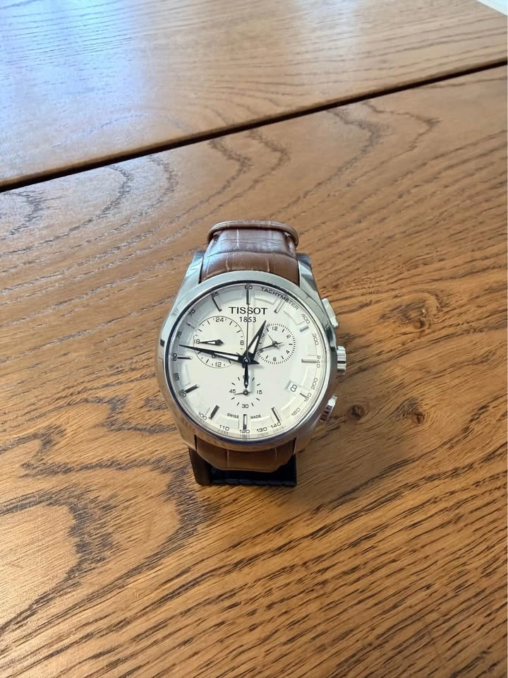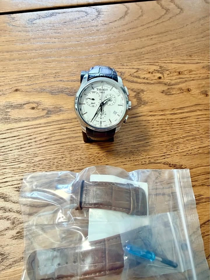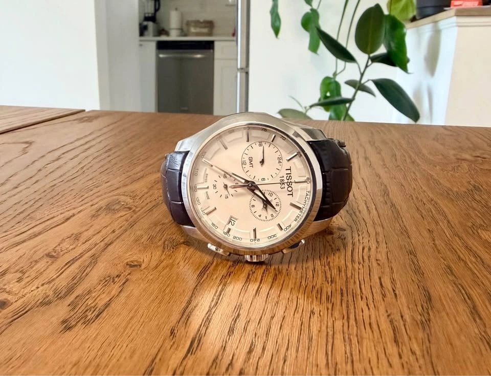 Selling a Tissot Couturier GMT Chronograph with a white dial and quartz movement. The watch features a second time zone displayed via the top-left subdial, making it both stylish and practical.