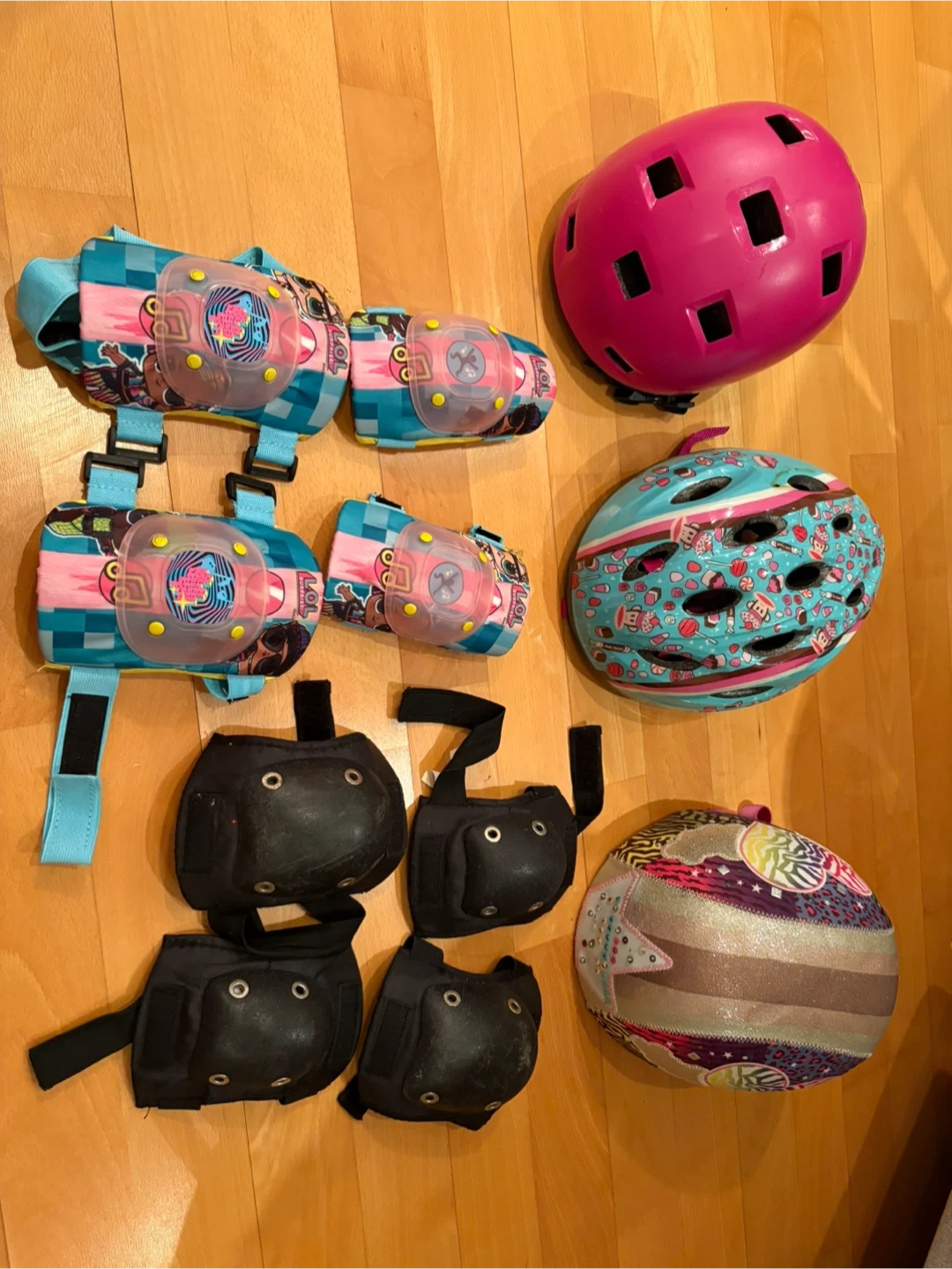 This set includes two helmets and protective pads for kids. One helmet is pink and the other has a colourful, patterned design. The protective gear includes knee pads and elbow pads for safety during activities.