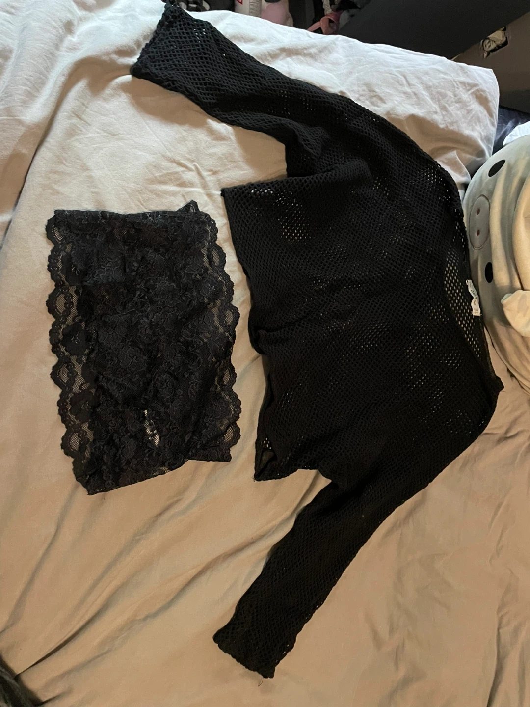This set includes a black mesh long sleeve top and a black lace bralette. The top is made of a breathable mesh material, and the bralette features intricate lace detailing. They're perfect for layering or as statement pieces on their own. $5 Each
