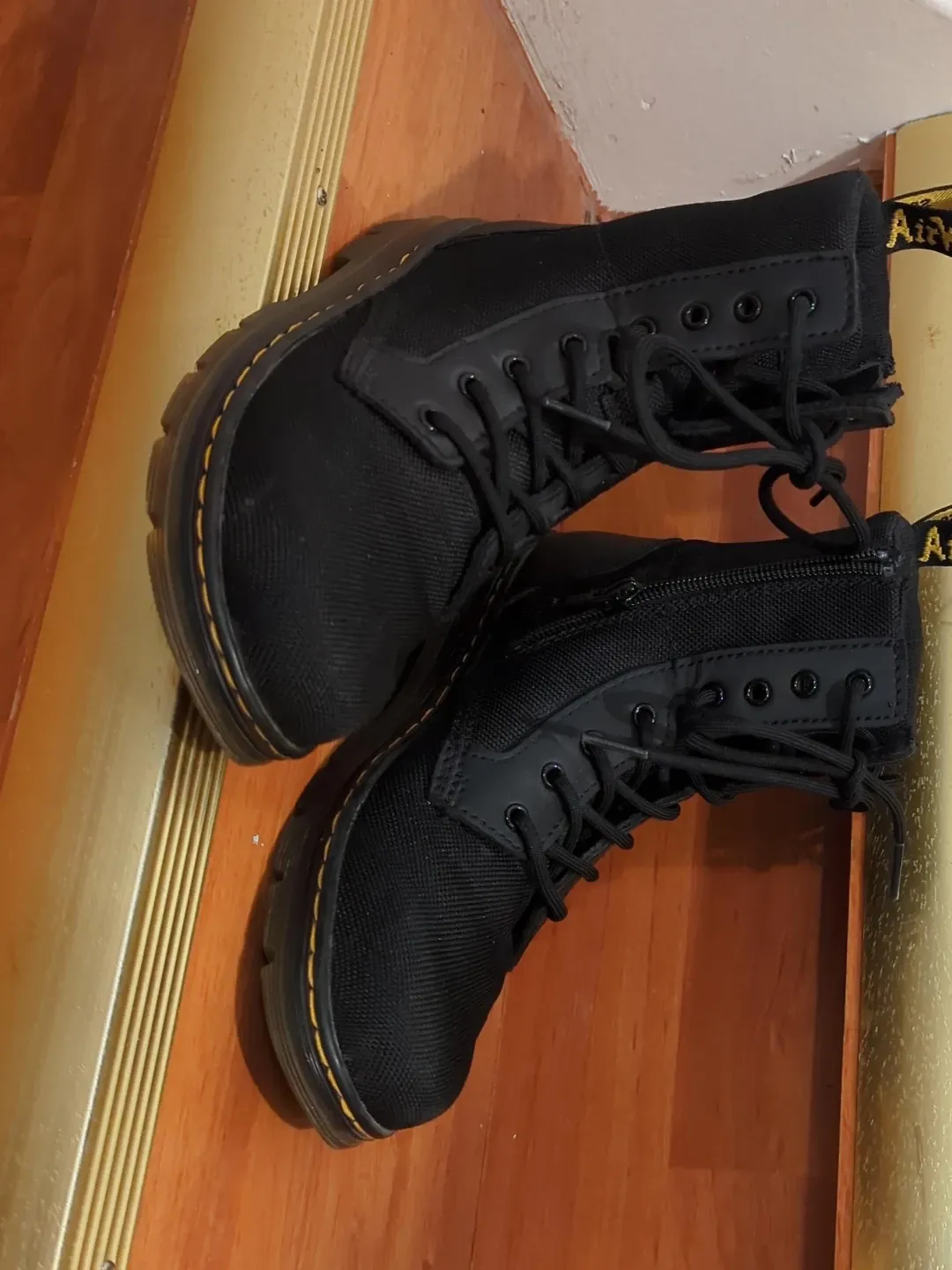 Dr. Martens black combat boots with side zippers. Made with durable fabric and the iconic yellow stitching on the sole. Perfect for everyday wear.