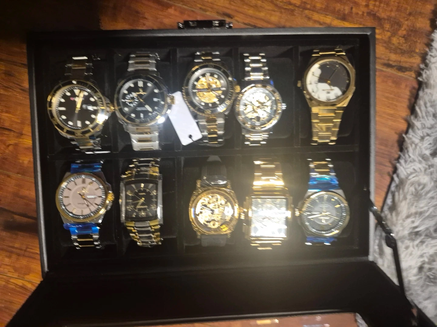 A collection of nine men's wristwatches featuring various styles and colours, including gold-tone and stainless steel bands. Some watches have skeleton dials. Comes in a black display box. All 9 for $500 w box or individuals starting at$50 BRAND NEW NEVER WORN!!!!!