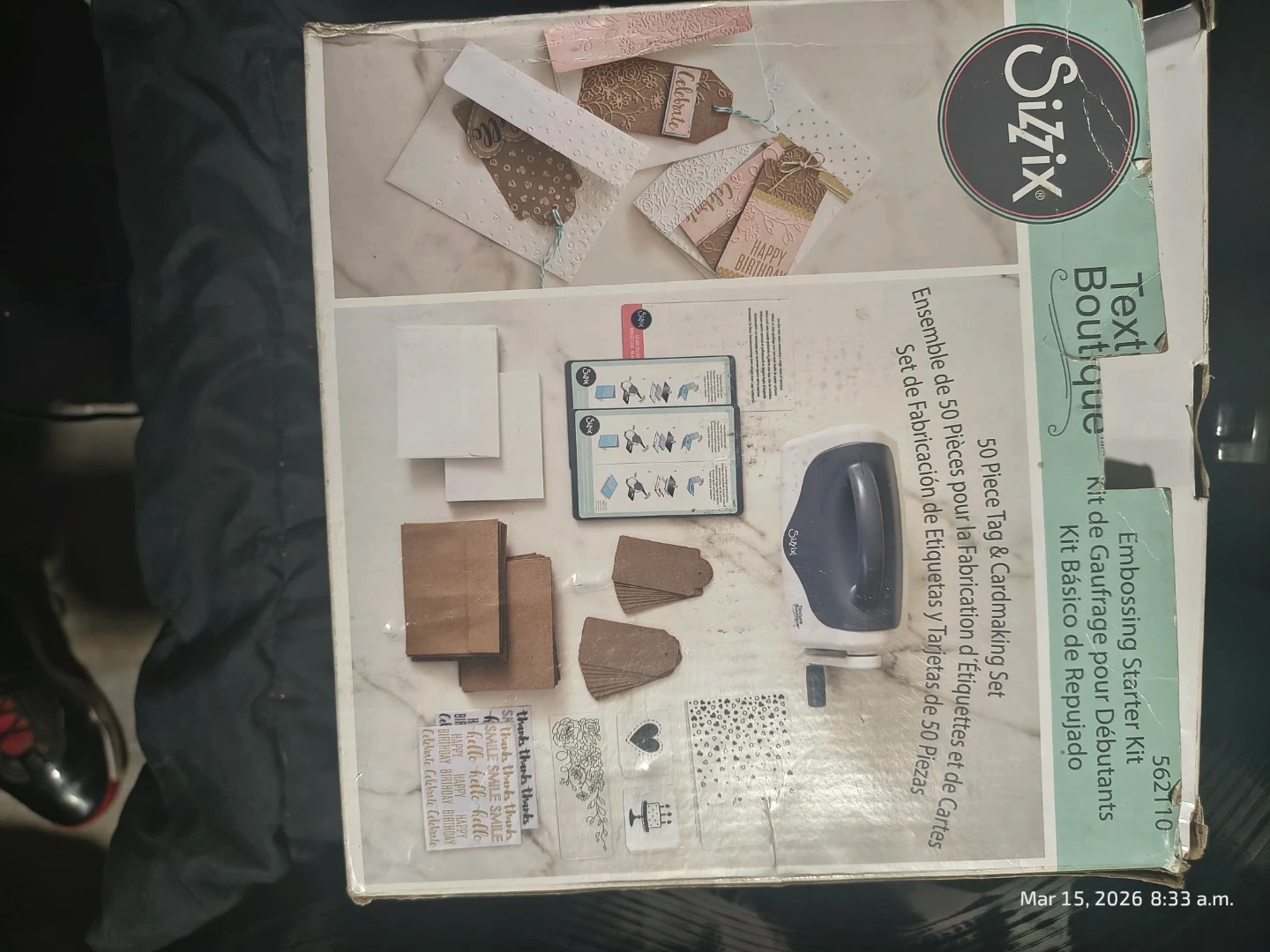 This Sizzix Texture Boutique embossing starter kit includes a machine, embossing pads, 4 embossing folders, and 20 A2 cards. Also comes with 1 pack of rub-ons, 1 sheet of rub-on sheets, and 1 instruction booklet. It's a comprehensive set for crafting and cardmaking.