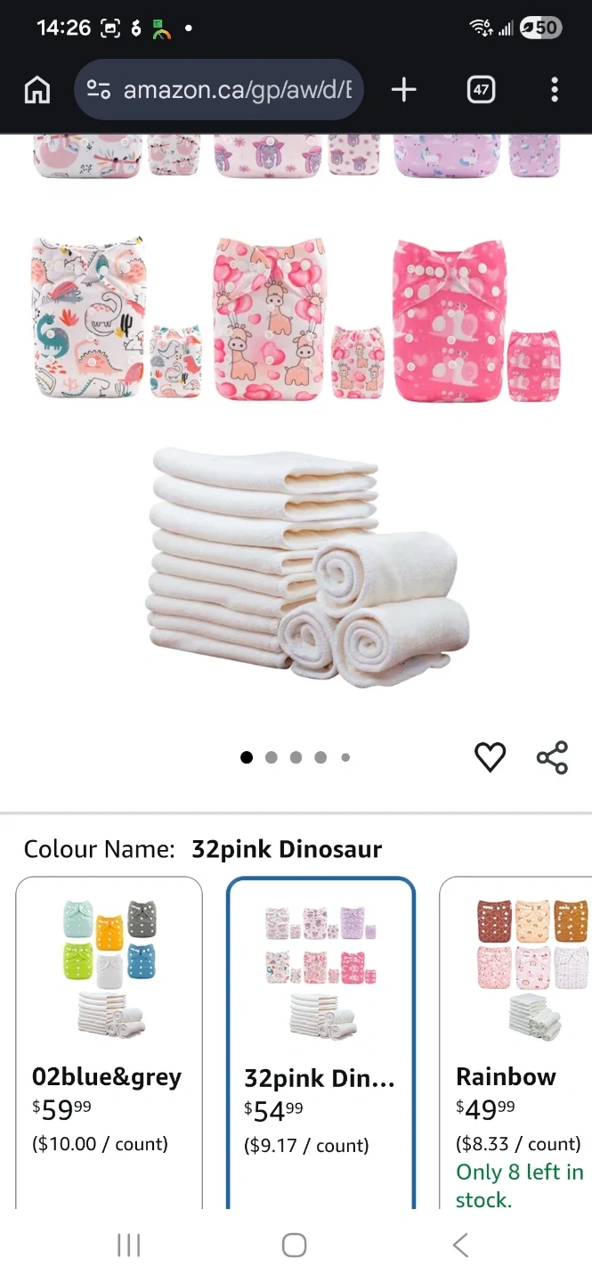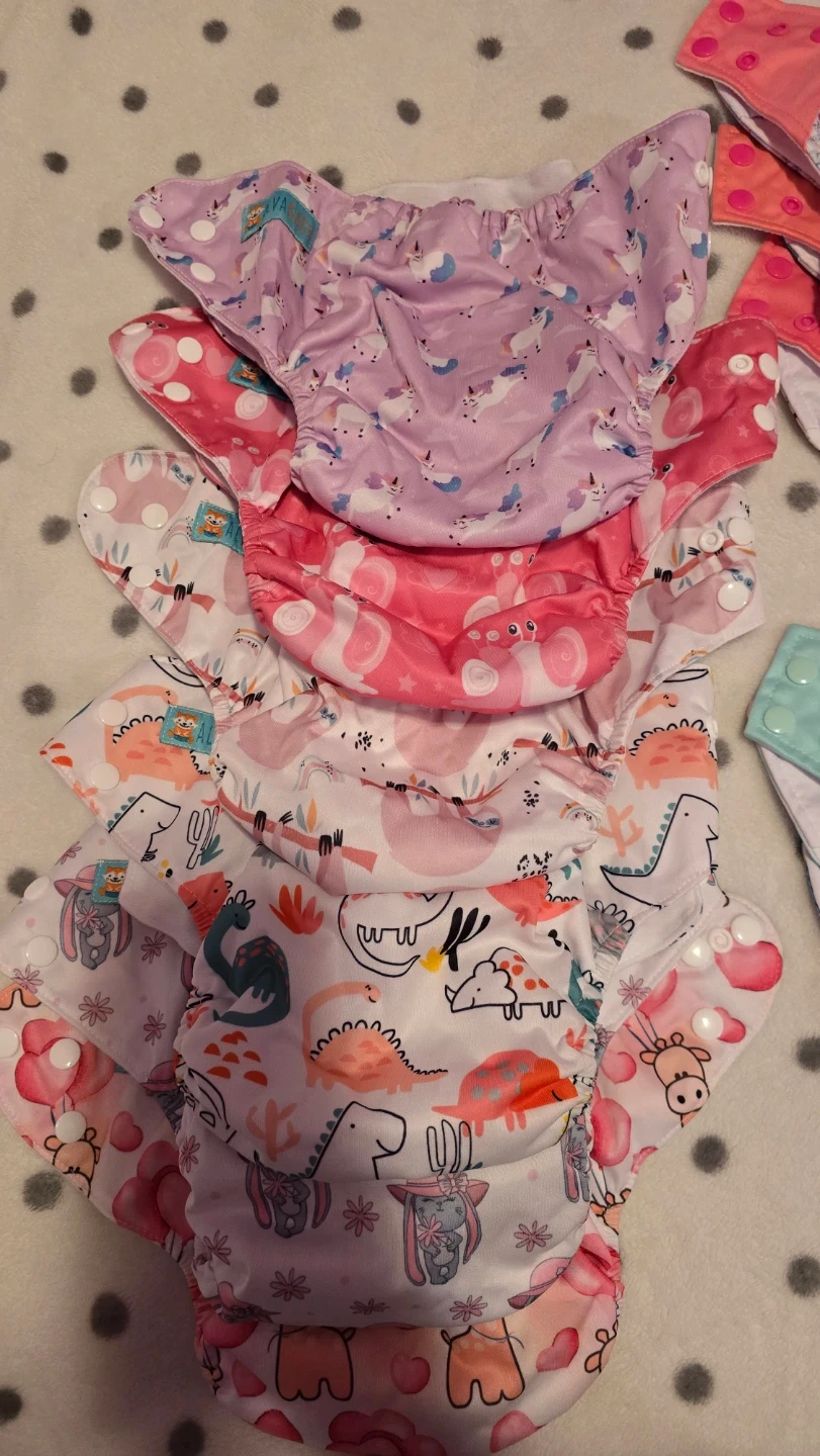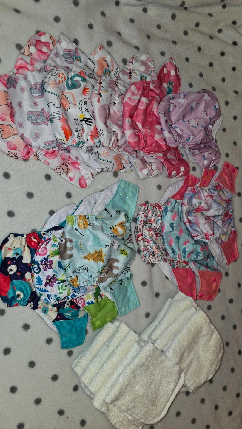 This is a lot of reusable cloth diapers with various fun prints. They feature adjustable snaps for a custom fit. Includes cloth inserts for absorbency