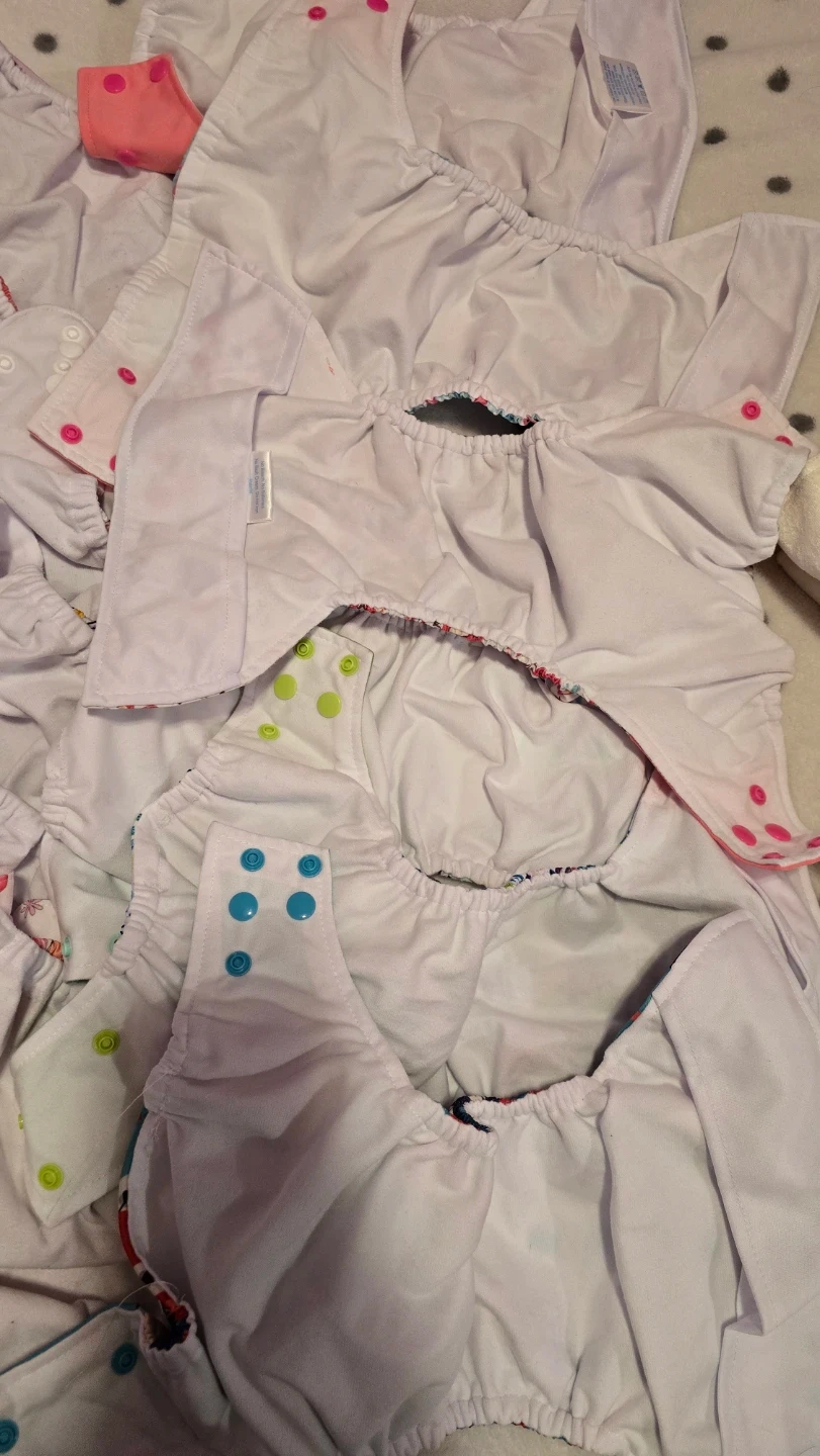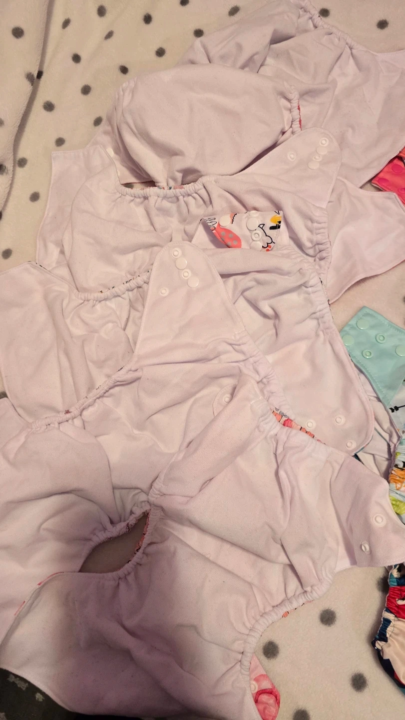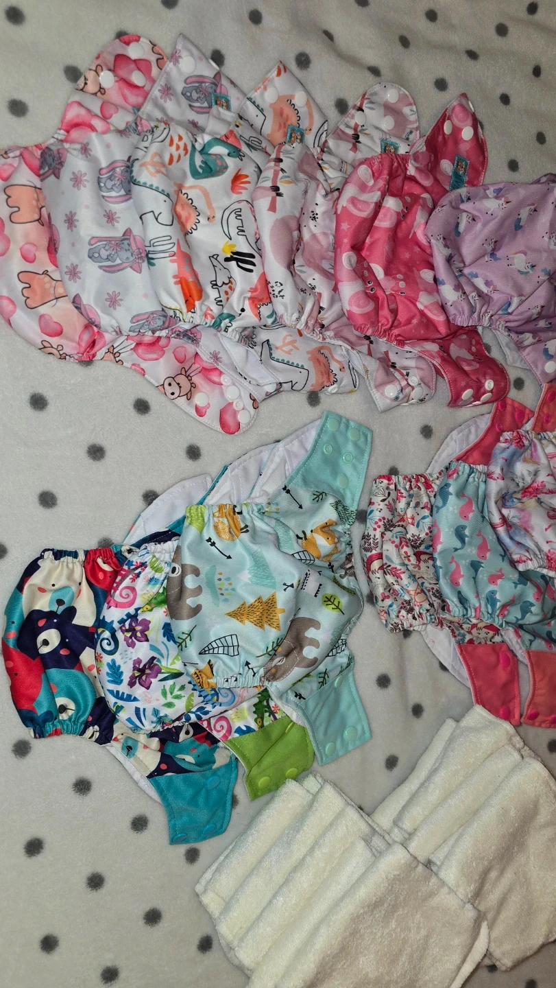 This is a lot of reusable cloth diapers with various fun prints. They feature adjustable snaps for a custom fit. Includes cloth inserts for absorbency