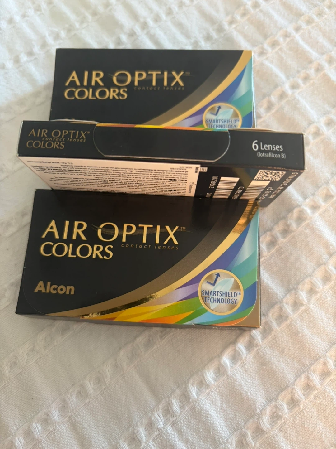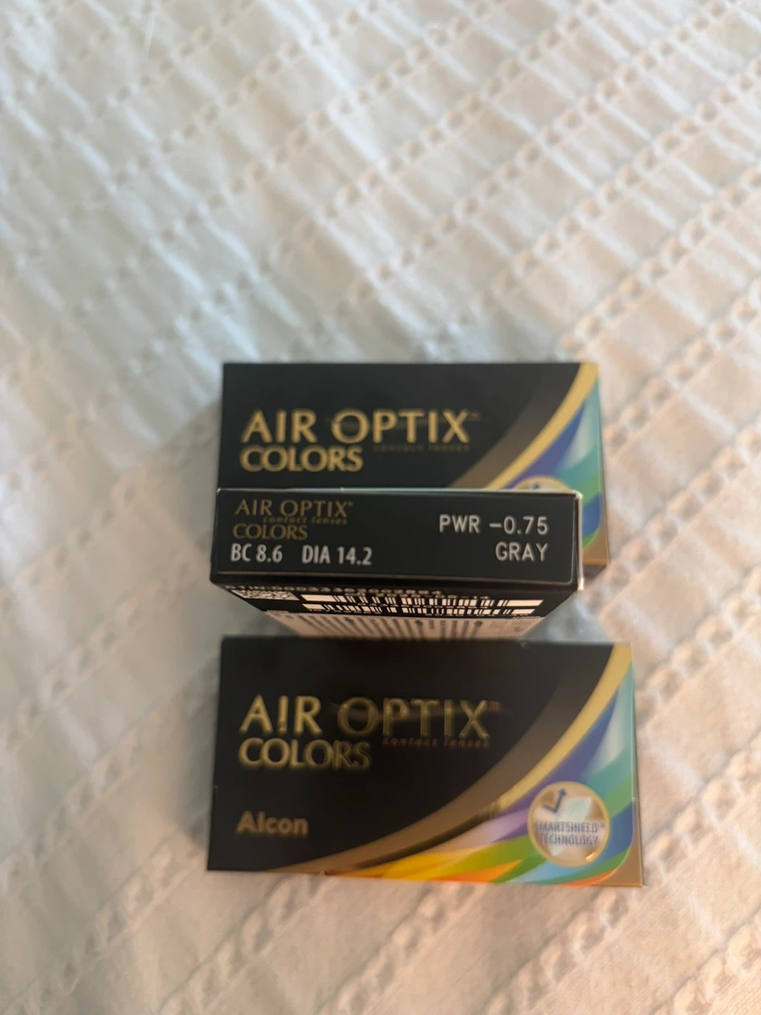 These are Air Optix Colors contact lenses in gray. Each box contains 6 lenses. The power is -0.75 with a BC of 8.6 and a DIA of 14.2. They're made with Smartshield Technology for comfort. New boxes are sealed - 50$ ea box