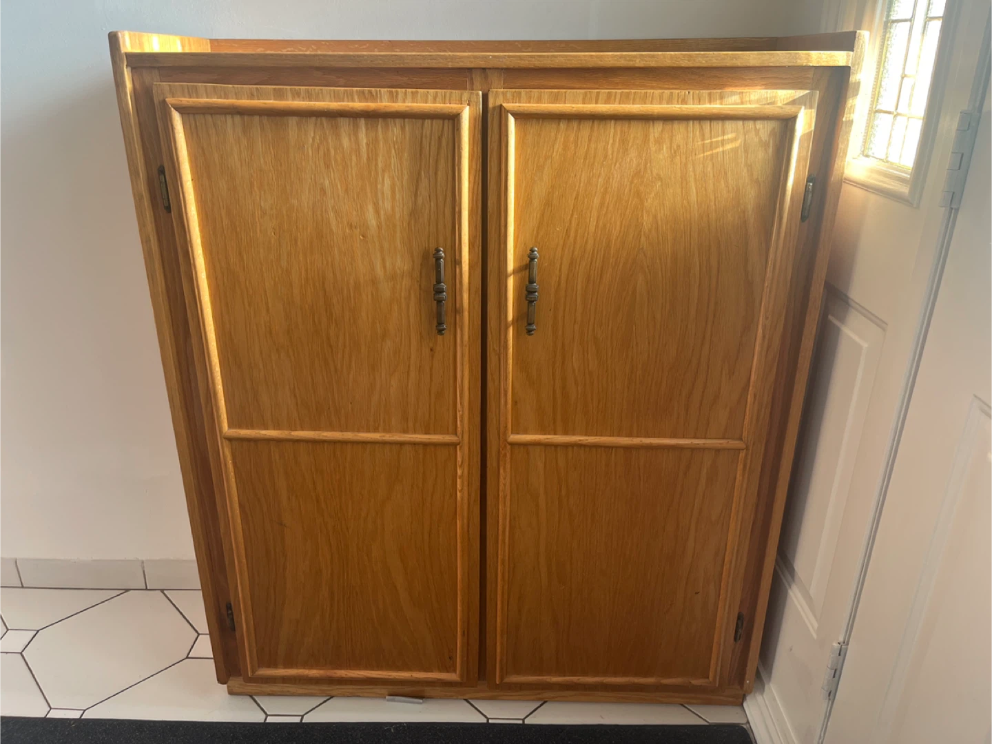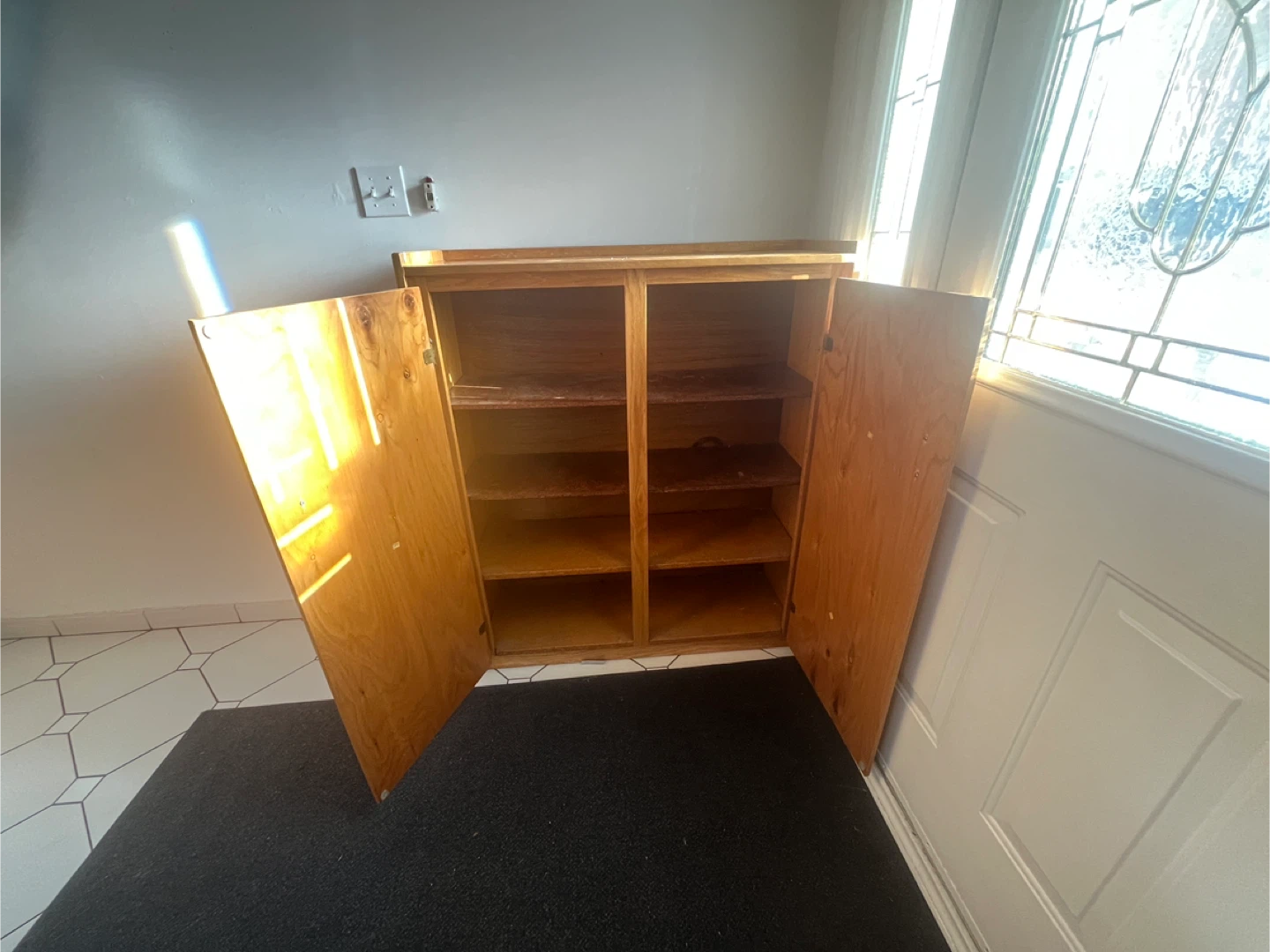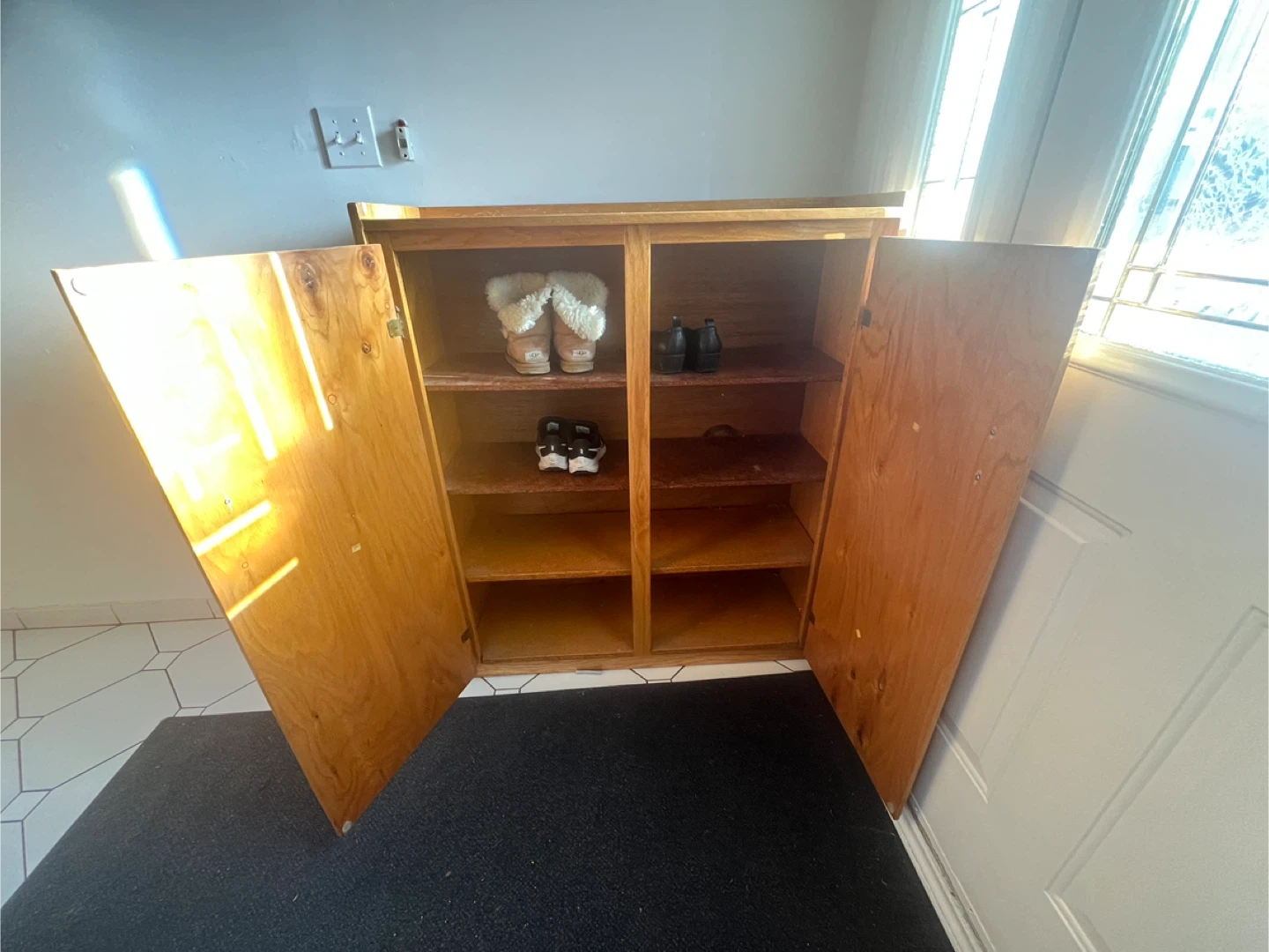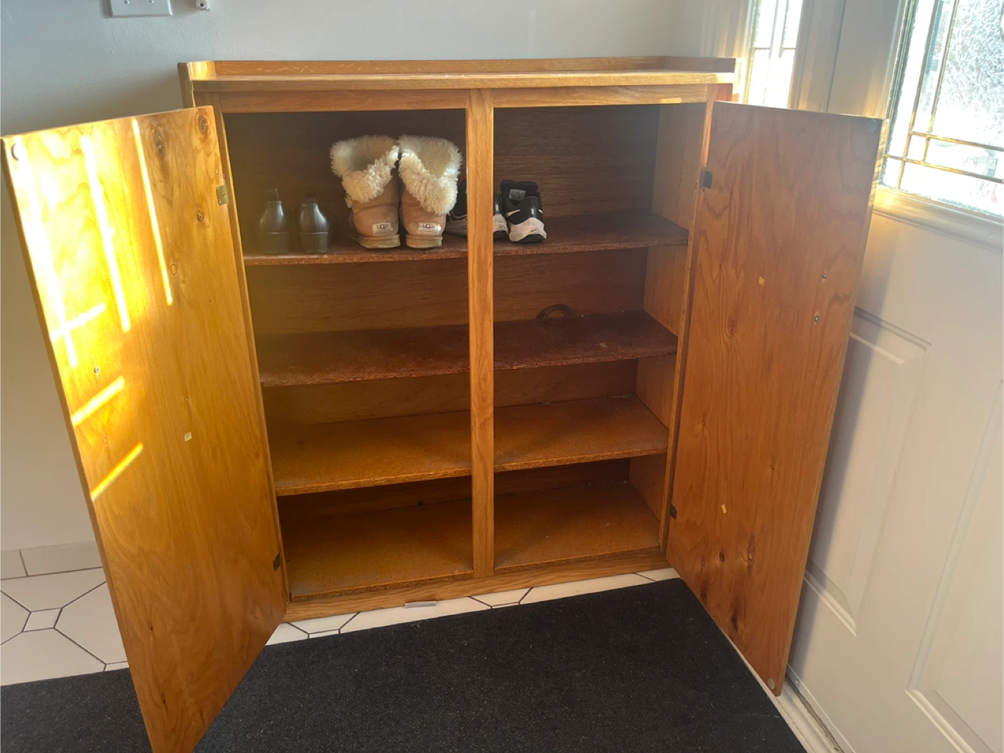 A practical wooden cabinet for storing shoes. It features two sections, each with multiple shelves, behind double doors. Great for entryway organization!