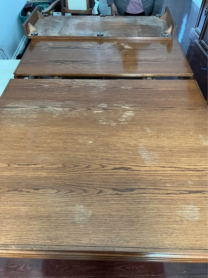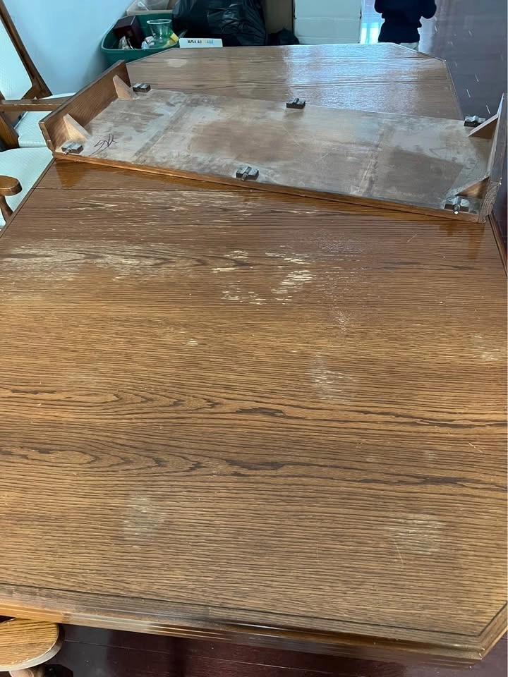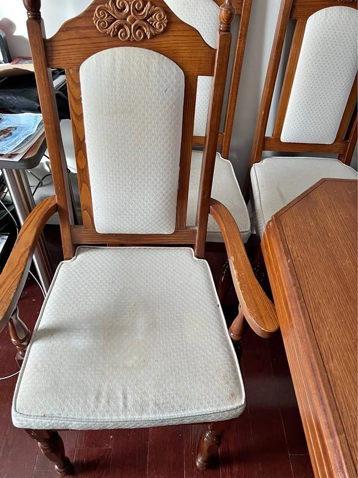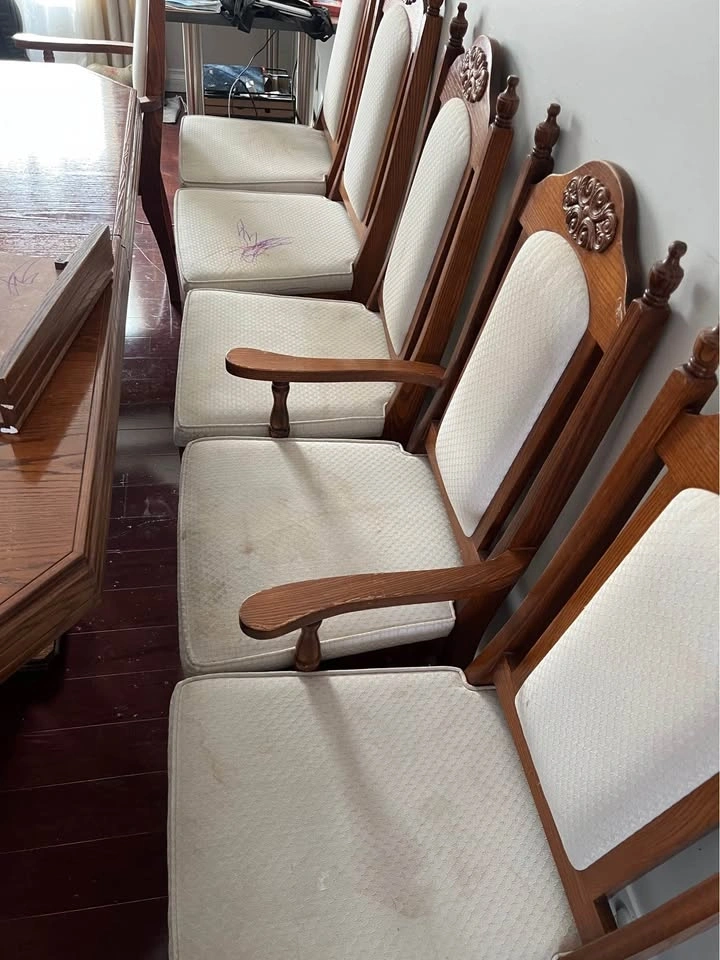 Dining table and 6 chairs. All chairs need to be cleaned and probably better upholstery. Everything else is in good condition. Selling as a set.