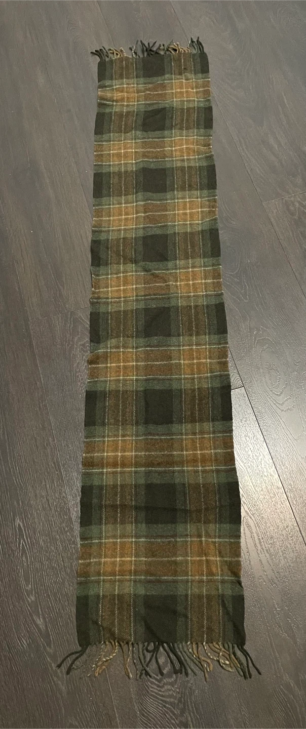 This Marks & Spencer scarf is made from pure new wool. It features a classic plaid pattern in green and brown tones with fringe detailing. A great accessory for cooler weather!