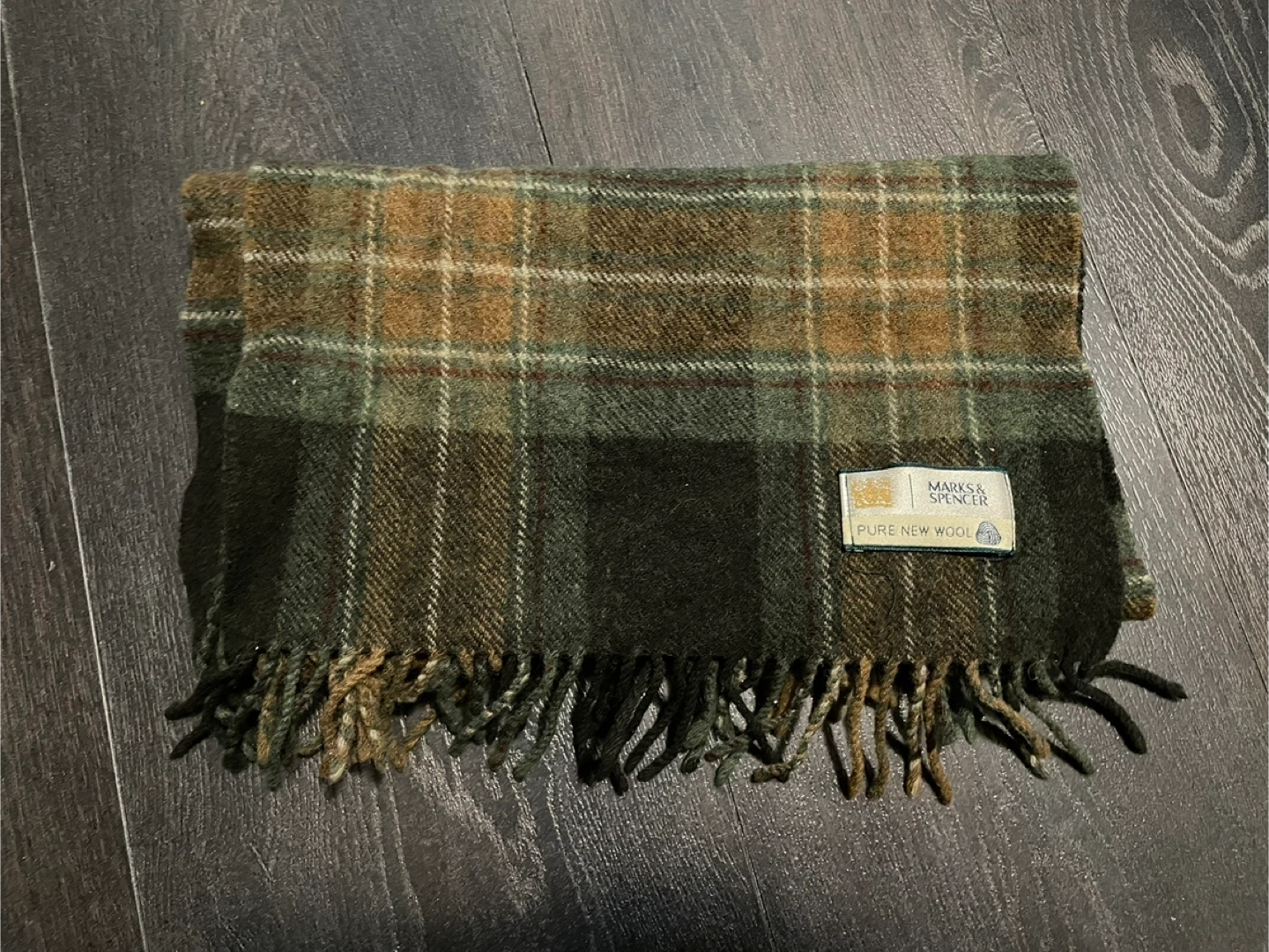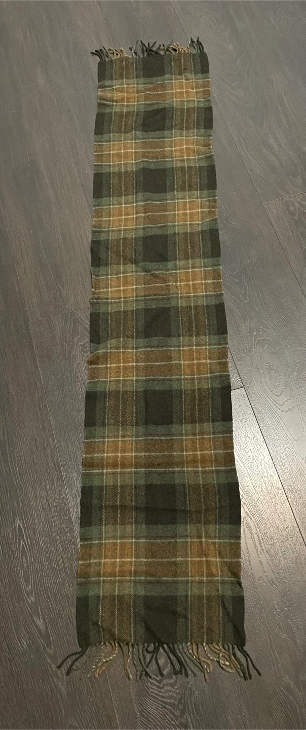 This Marks & Spencer scarf is made from pure new wool. It features a classic plaid pattern in green and brown tones with fringe detailing. A great accessory for cooler weather!