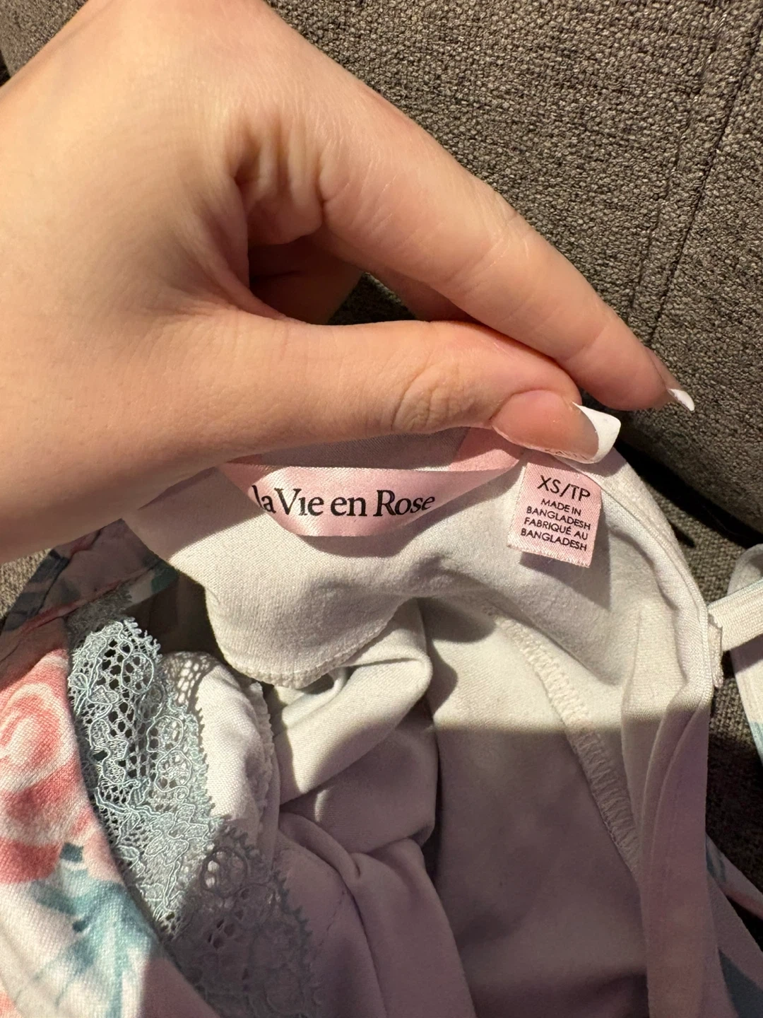 Selling a cute pajama set from La Vie en Rose! The set features a floral pattern with roses and leaves. The size is XS.