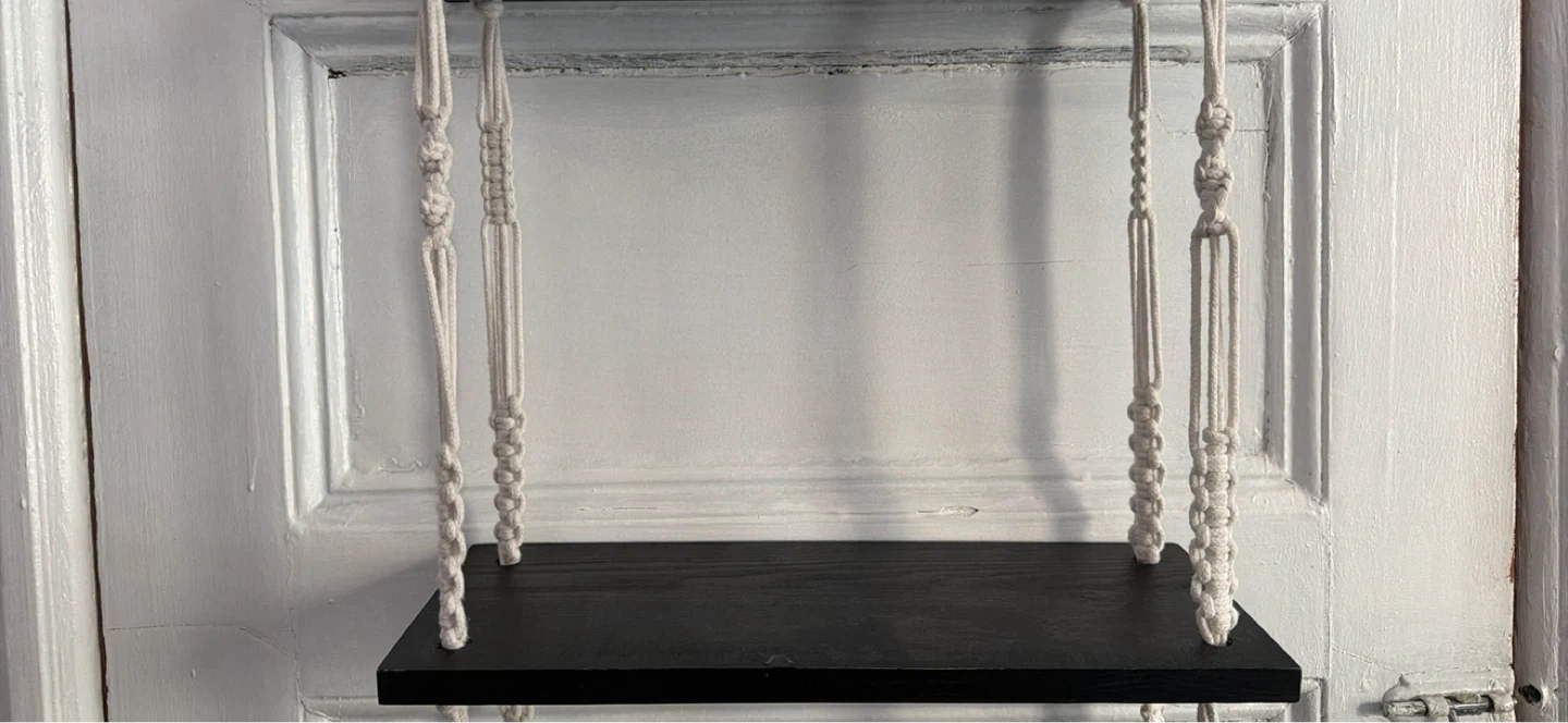This macrame hanging shelf features three black wooden tiers suspended by cream-colored cotton rope. It's perfect for displaying plants, decor, or small items. Easy to hang with its integrated loop.