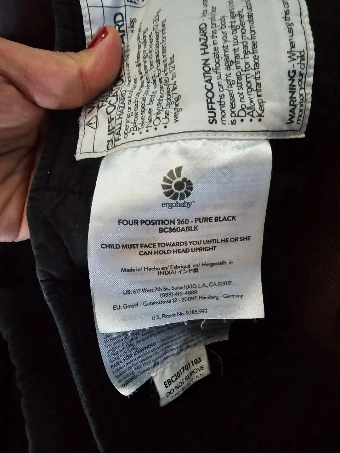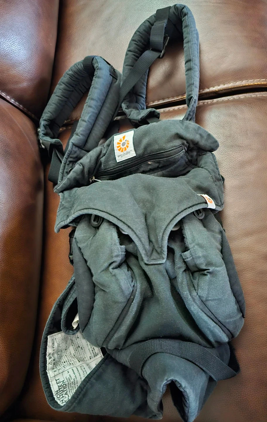 GIFTING an Ergobaby Four Position 360 carrier in Pure Black! This carrier is designed so your child must face towards you until he or she can hold head upright. I just washed it and ready for a new family to enjoy!
