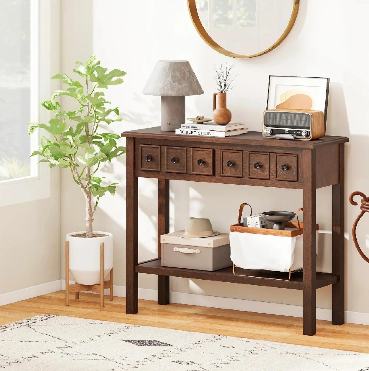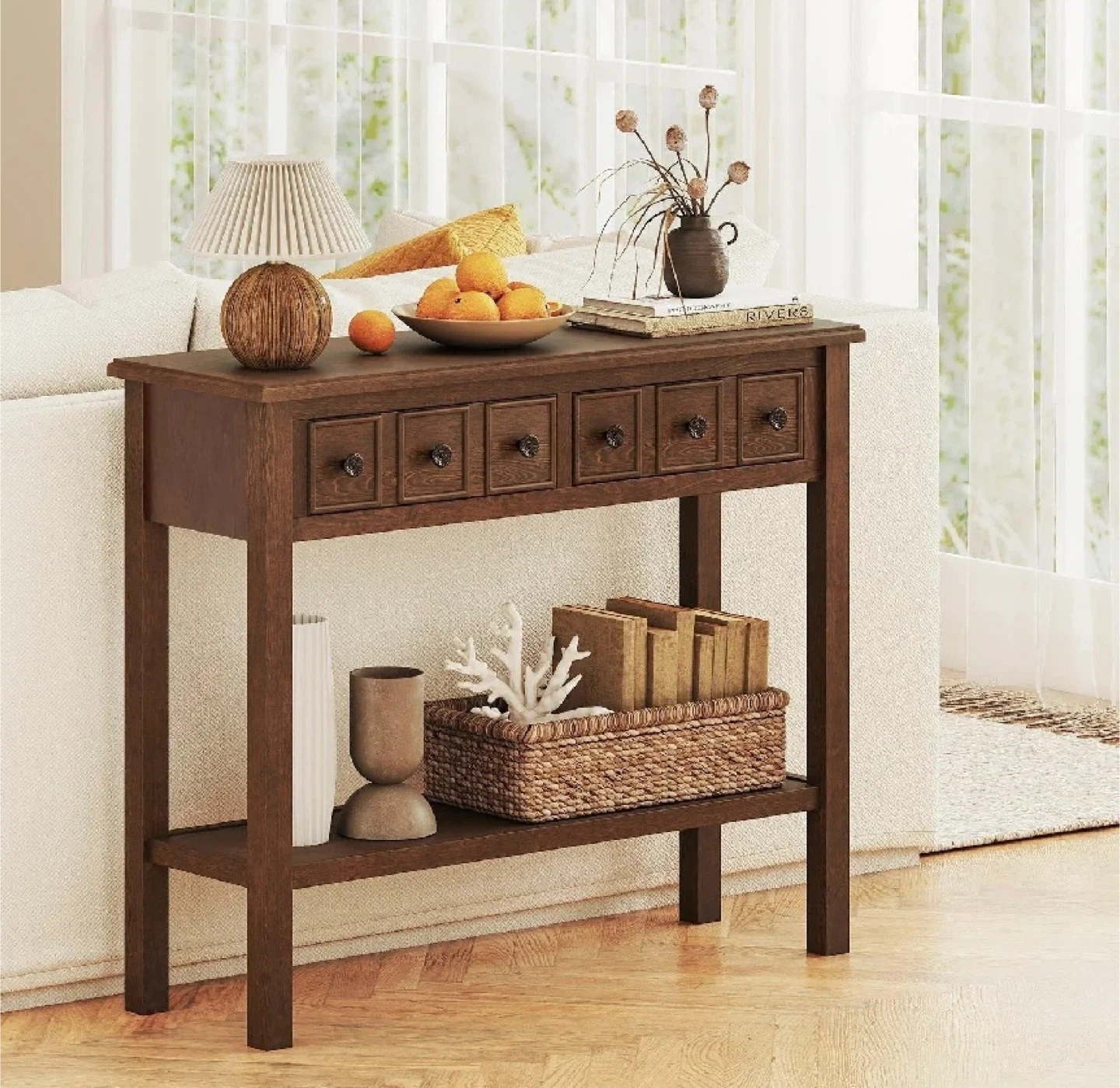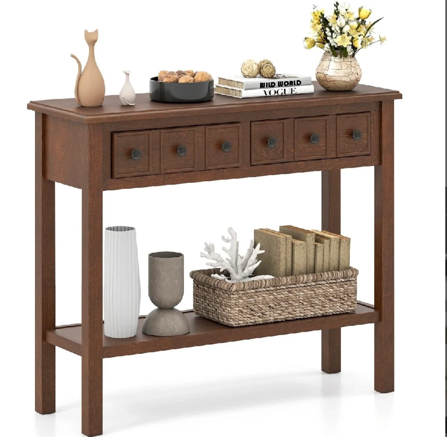 This brand new, in-box 38-inch rustic console table in espresso finish is perfect for adding a touch of elegance to your entryway or living room, offering both style and functionality with its drawers and shelf.