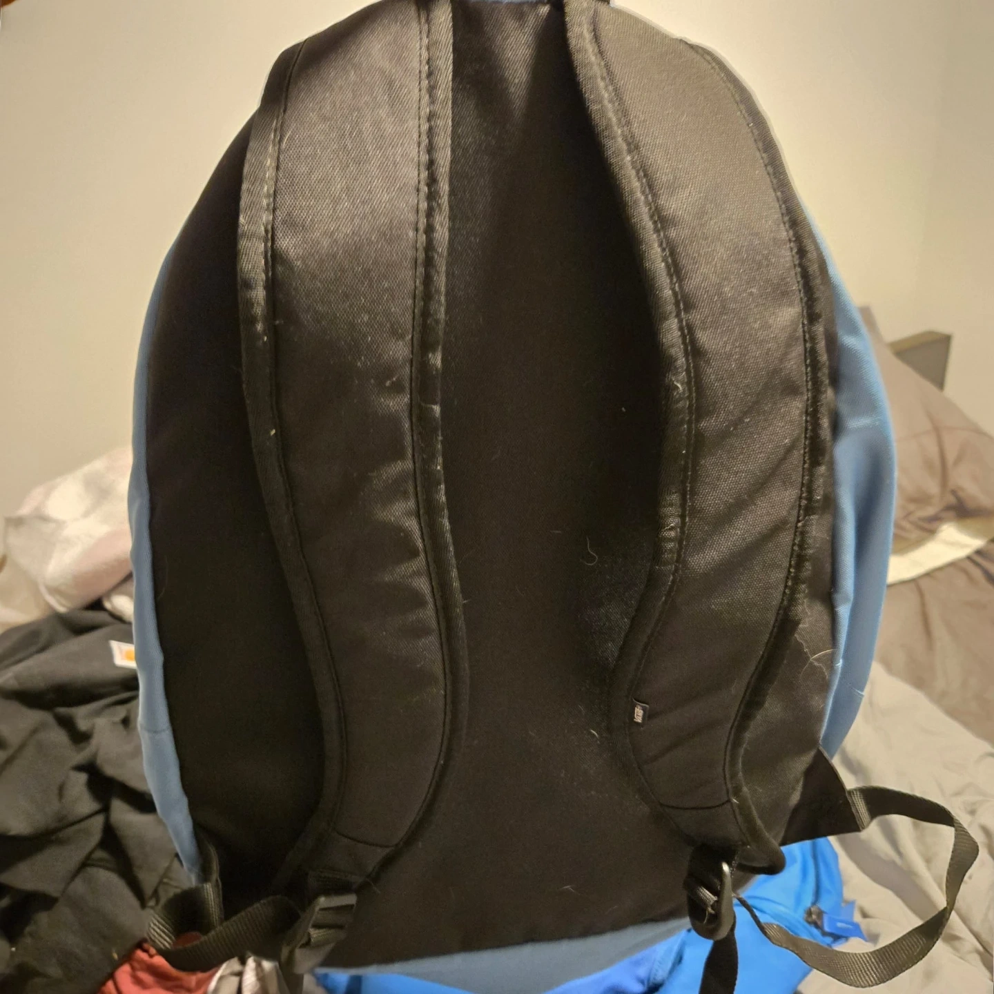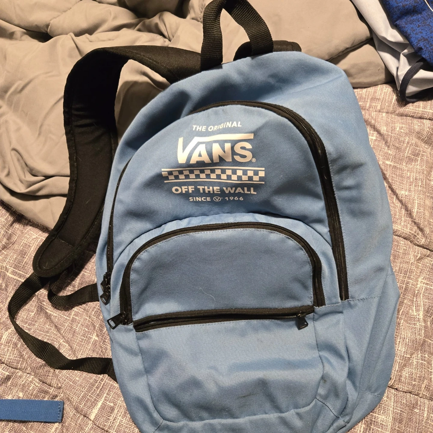 This is a light blue Vans backpack with the "Off The Wall" logo on the front. It features a main compartment and a smaller front pocket for organization. The straps are adjustable and padded for comfort. It's a classic design suitable for everyday use.