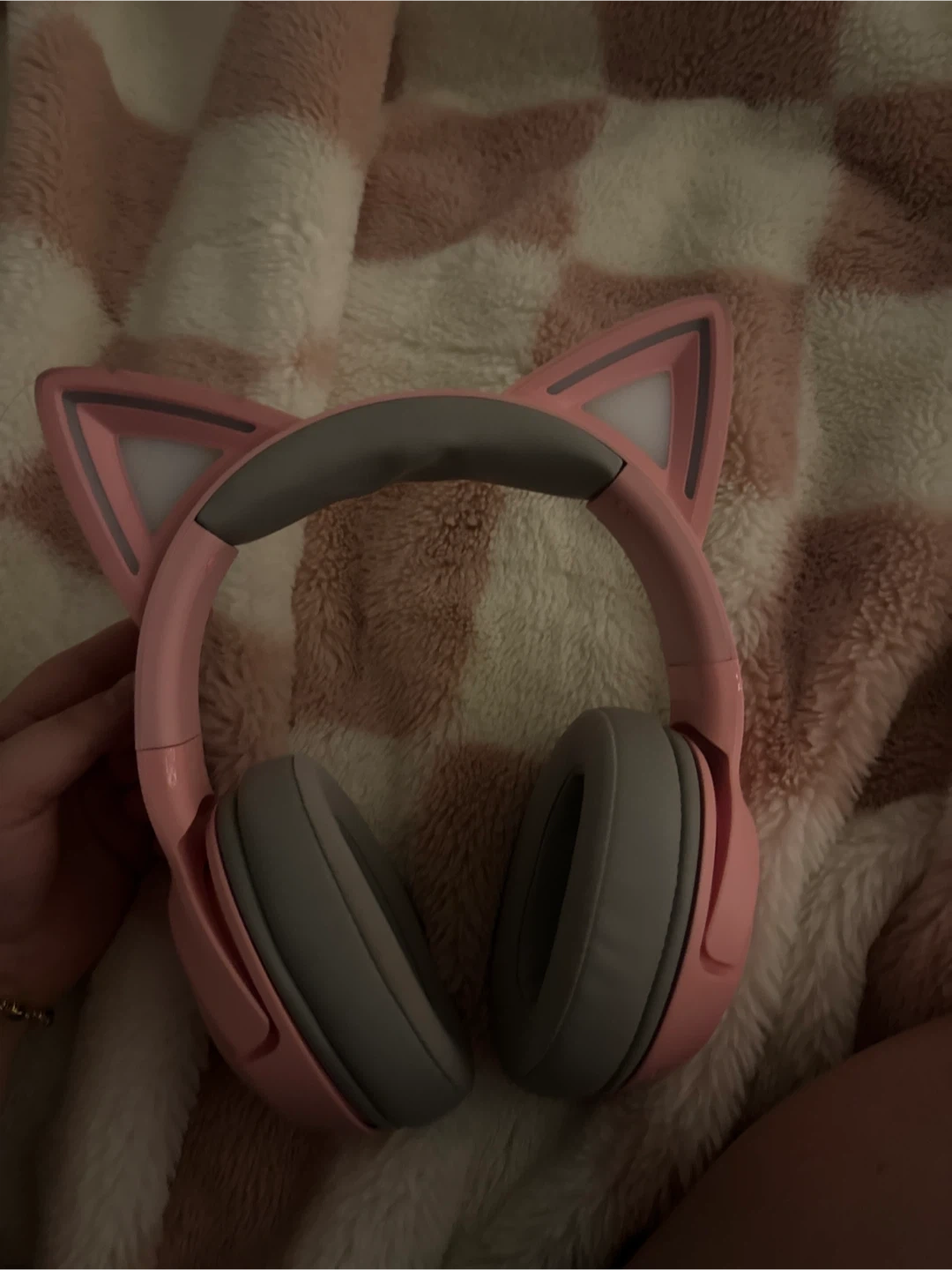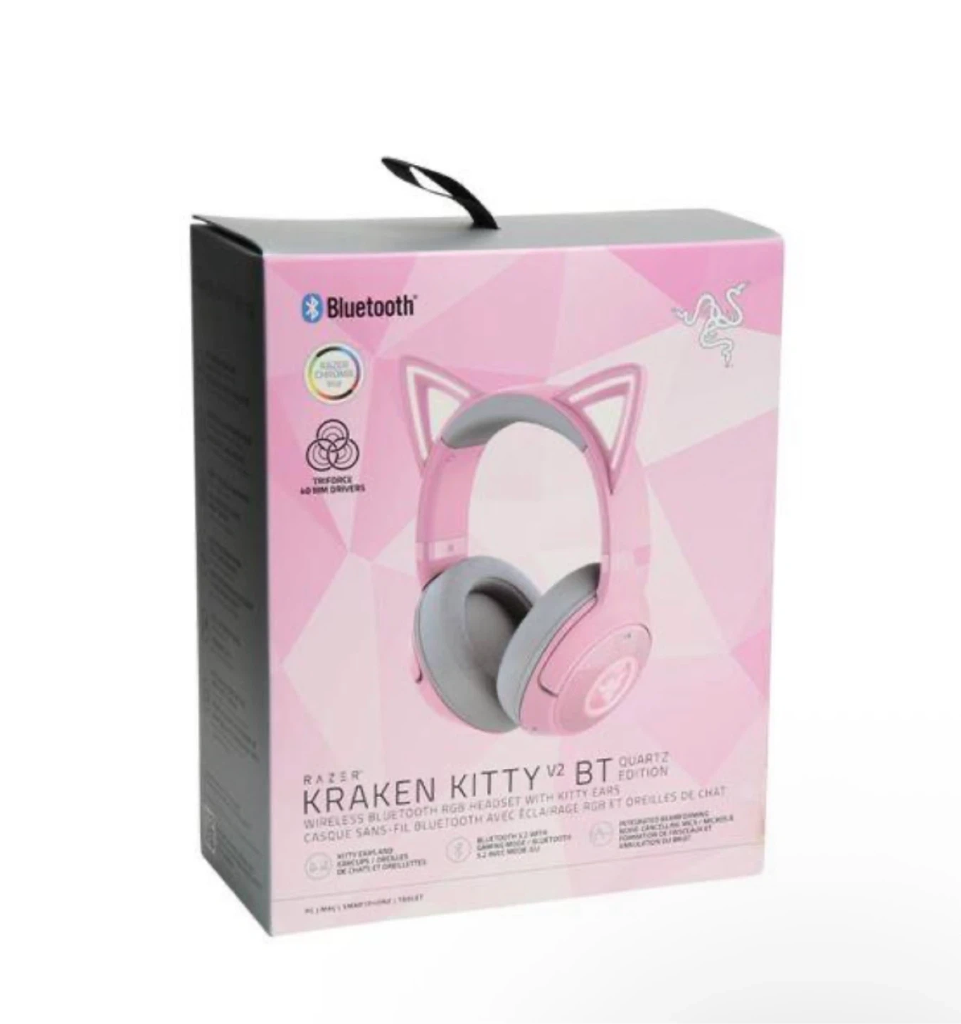 This is the Razer Kraken Kitty V2 BT wireless headset in Quartz Pink. It features Bluetooth connectivity and cute kitty ear accents. With customizable LED lights!