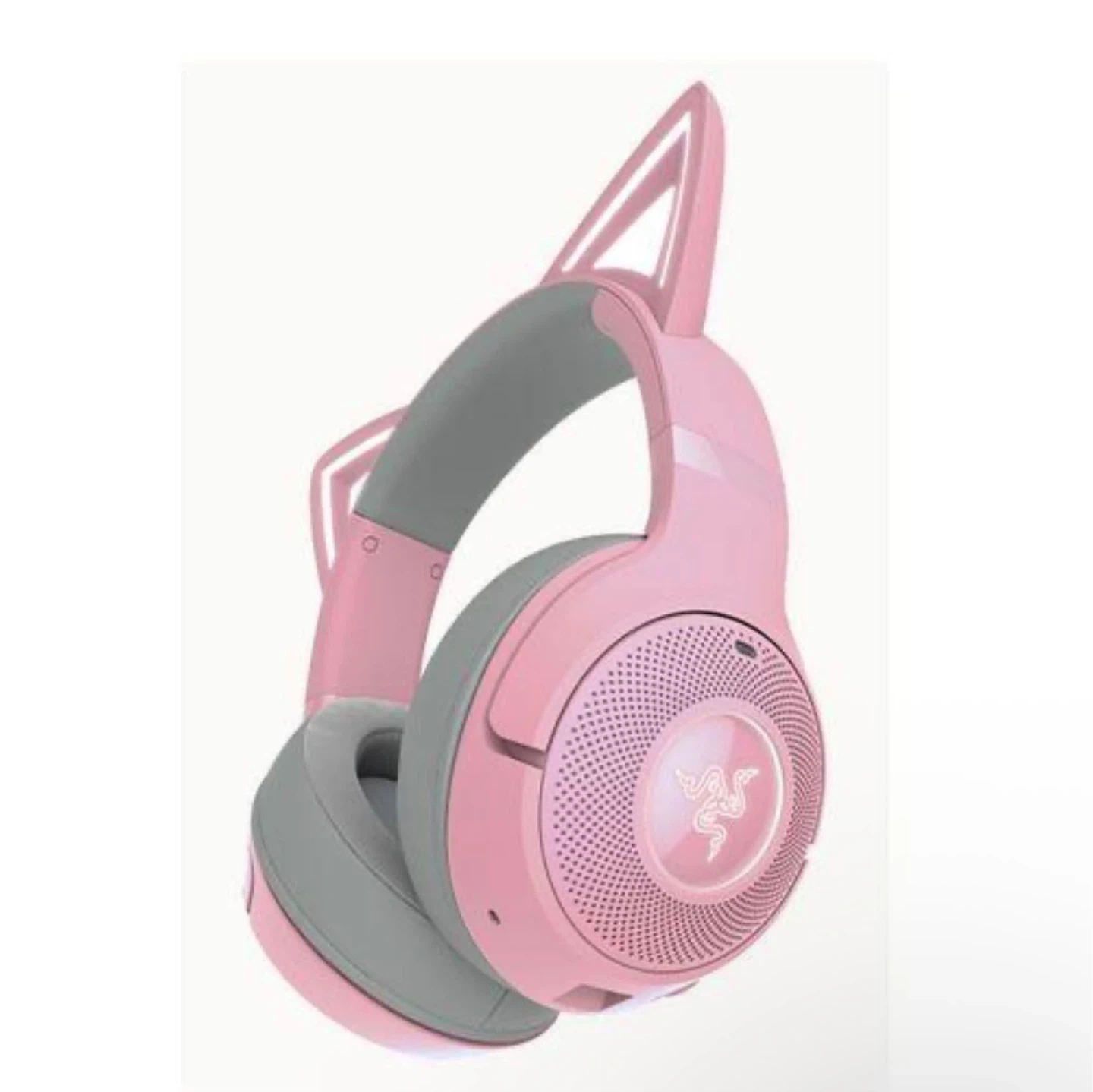 This is the Razer Kraken Kitty V2 BT wireless headset in Quartz Pink. It features Bluetooth connectivity and cute kitty ear accents. With customizable LED lights!