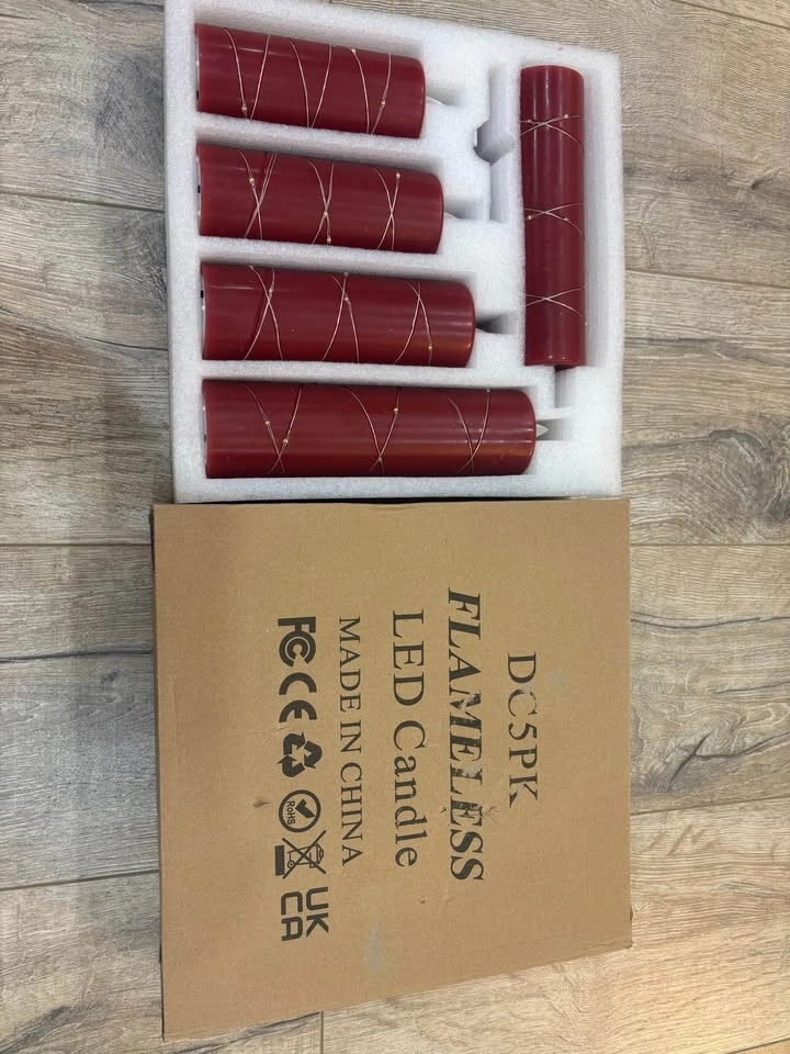 Selling a beautiful 5-pack set of red Flameless LED Candles, wrapped with elegant fairy string lights. This set is brand new and in perfect condition. Makes an excellent gift for housewarmings, anniversaries, or any special occasion.