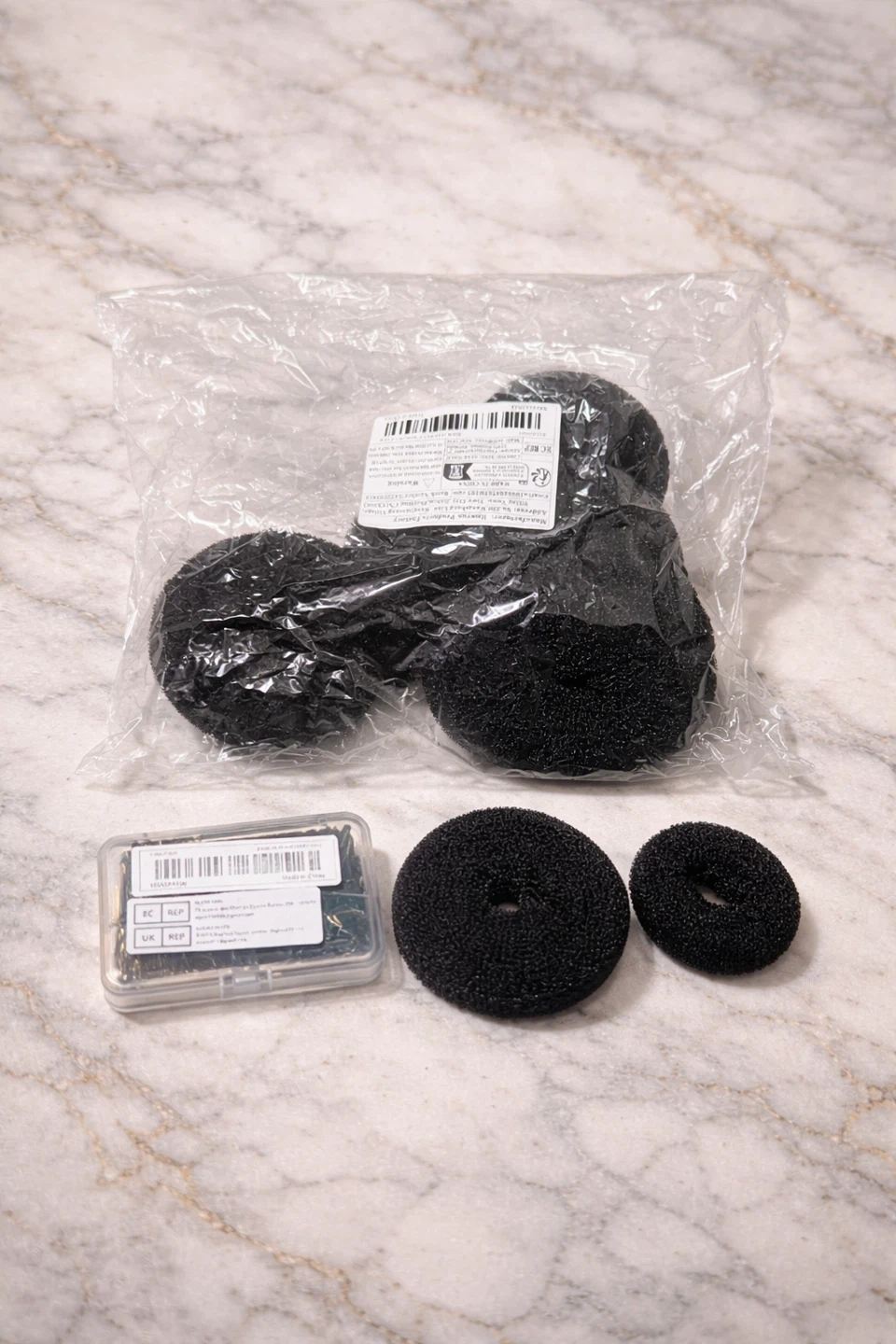 This set includes three black hair doughnut bun makers in different sizes. Also included is a box of bobby pins. These are great for creating neat and tidy hair buns!