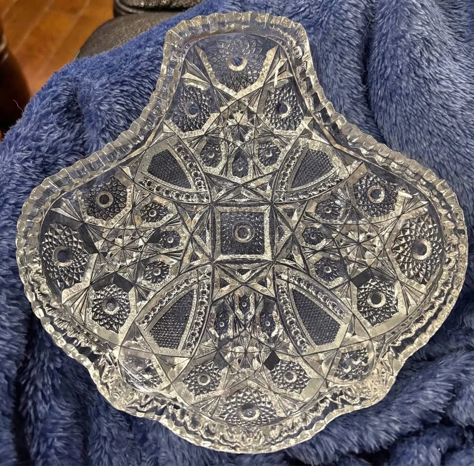Like new. Jagged edge cut glass shallow bowl. Very odd shape, with a few different patterns. Quite eclectic. No chips or cracks, roughly 7.5” square, 1.5” deep. Pickup in a tote for contactless pickup. Cash or e-transfer accepted.