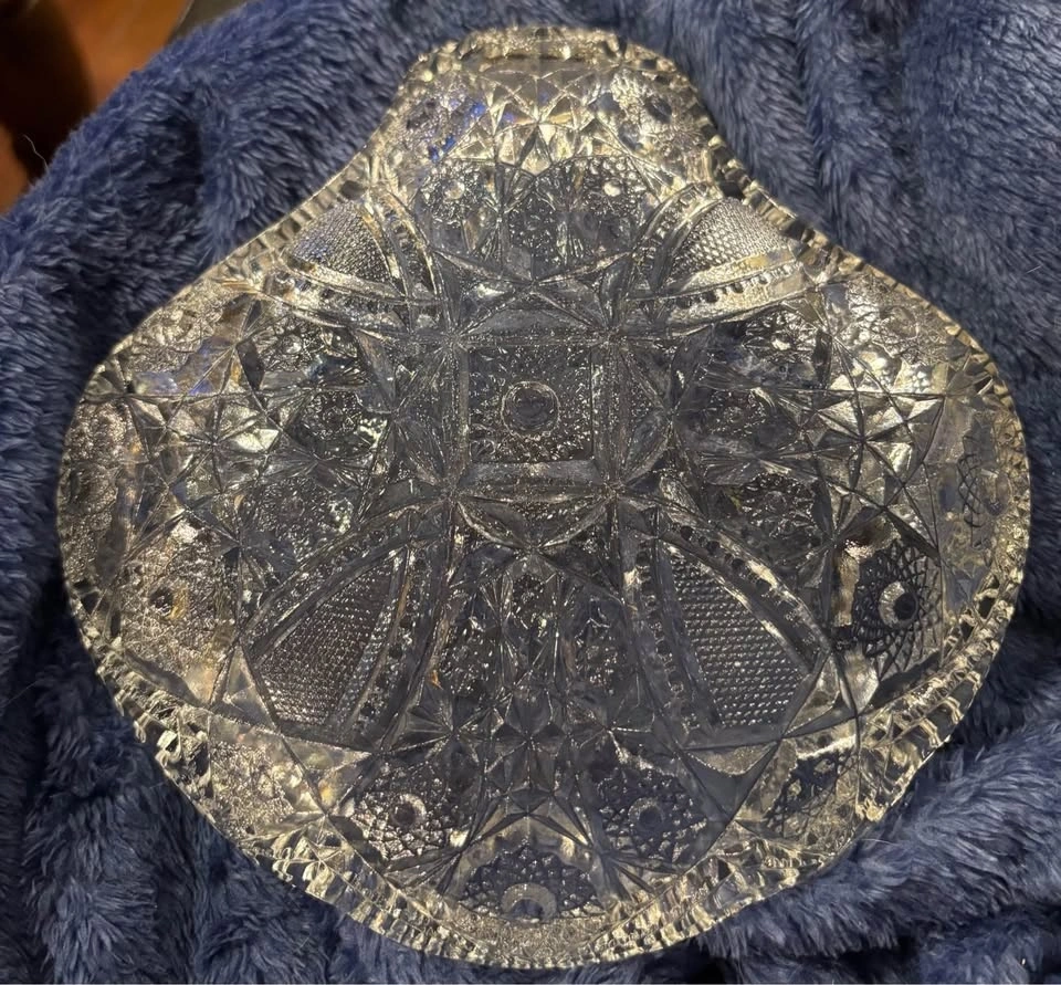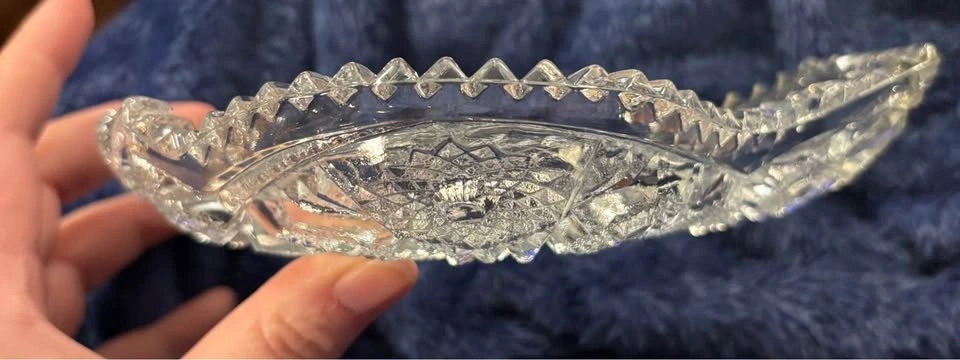 Like new. Jagged edge cut glass shallow bowl. Very odd shape, with a few different patterns. Quite eclectic. No chips or cracks, roughly 7.5” square, 1.5” deep. Pickup in a tote for contactless pickup. Cash or e-transfer accepted.