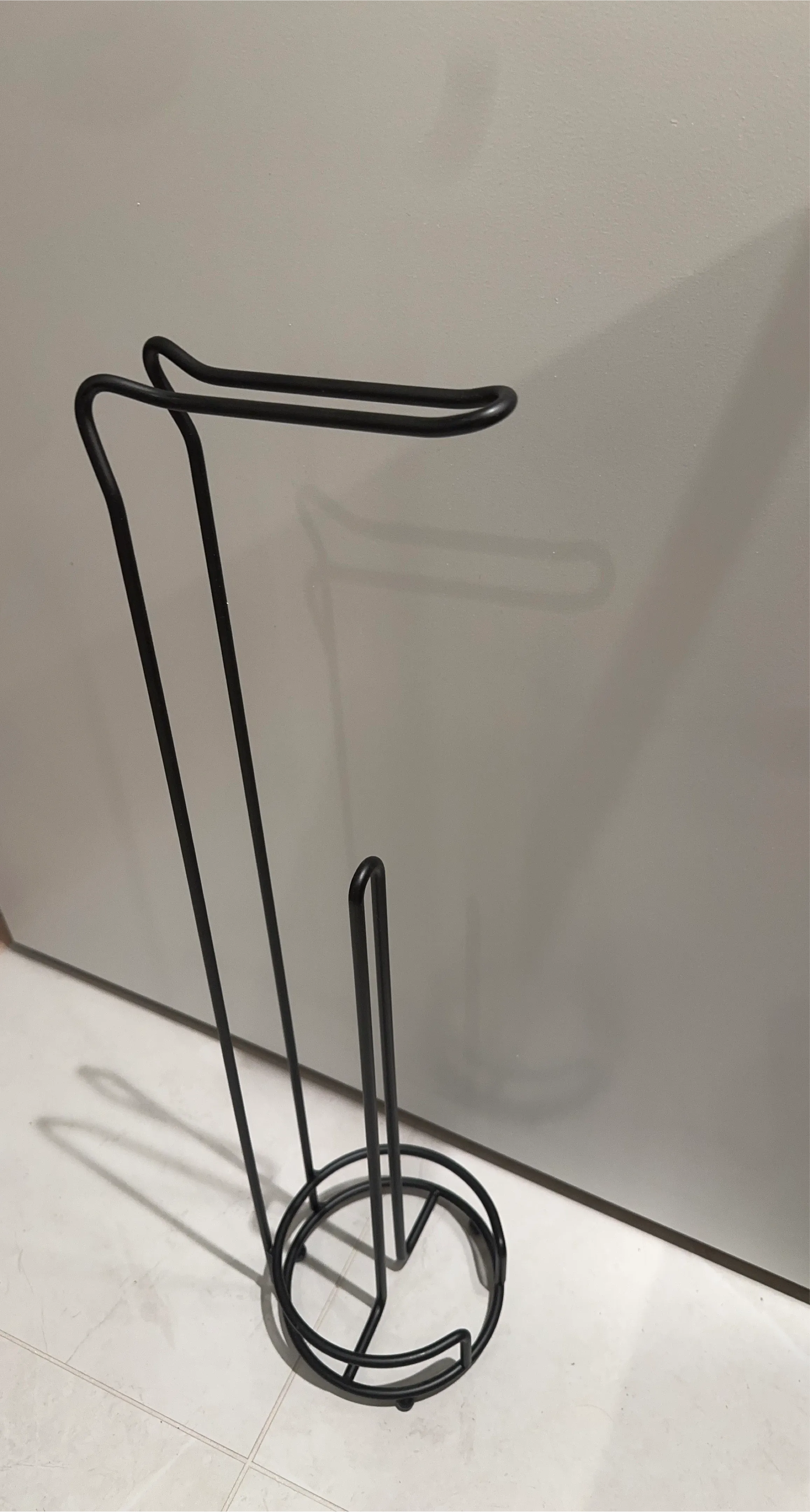 Heavy duty, solid, thick metal toilet paper stand which holds extra toilet paper rolls for easy access.