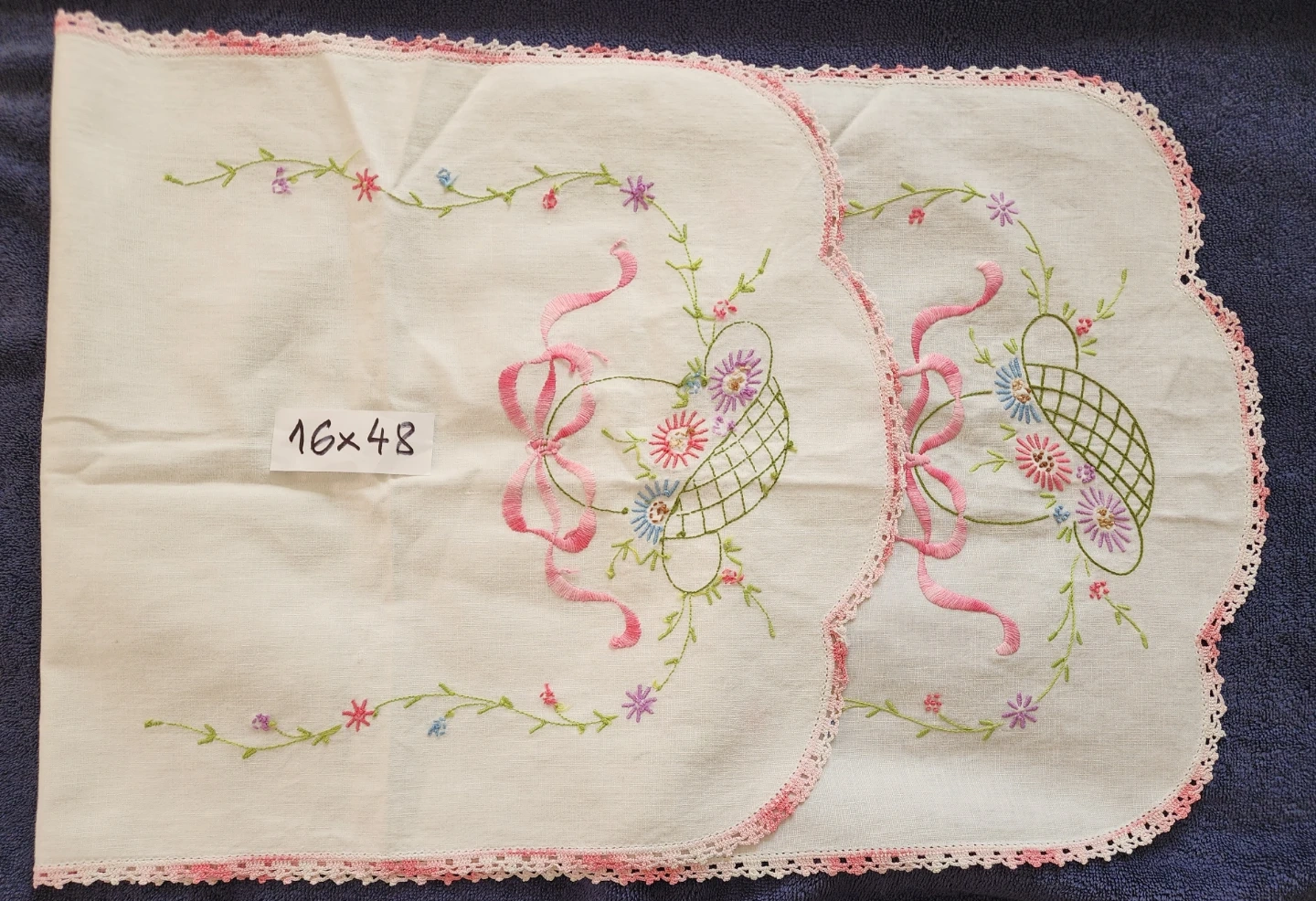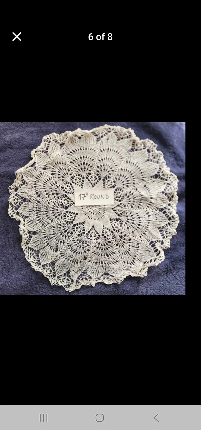 Beautiful set of handmade doilies and a table runner. Includes one 17" round doily, one 27"x27" doily, one 10"x24" runner, one 16"x48" embroidered runner, and a set of six 9"x8" placemats. Adds a delicate touch to any home decor!