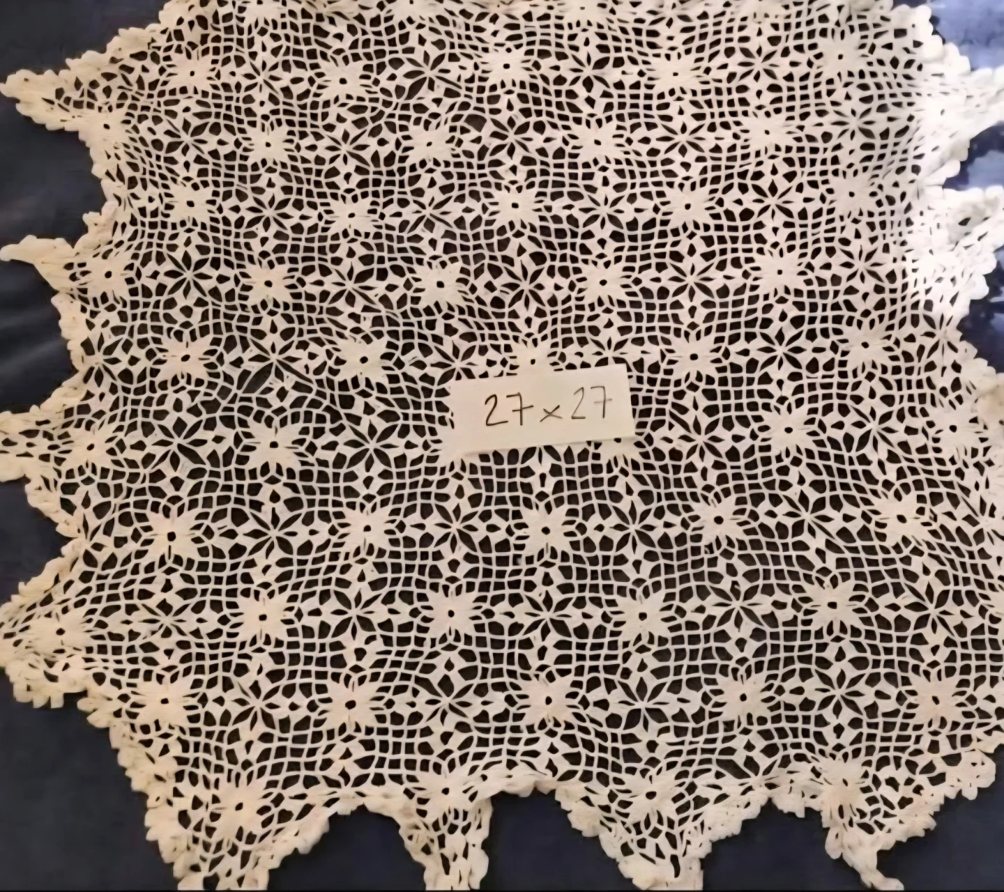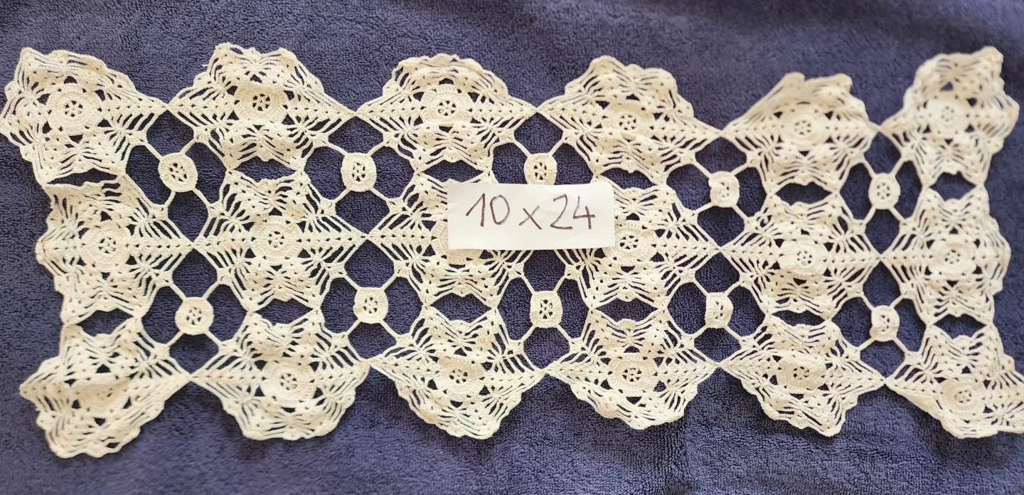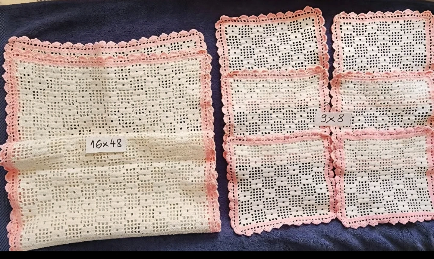 Beautiful set of handmade doilies and a table runner. Includes one 17" round doily, one 27"x27" doily, one 10"x24" runner, one 16"x48" embroidered runner, and a set of six 9"x8" placemats. Adds a delicate touch to any home decor!
